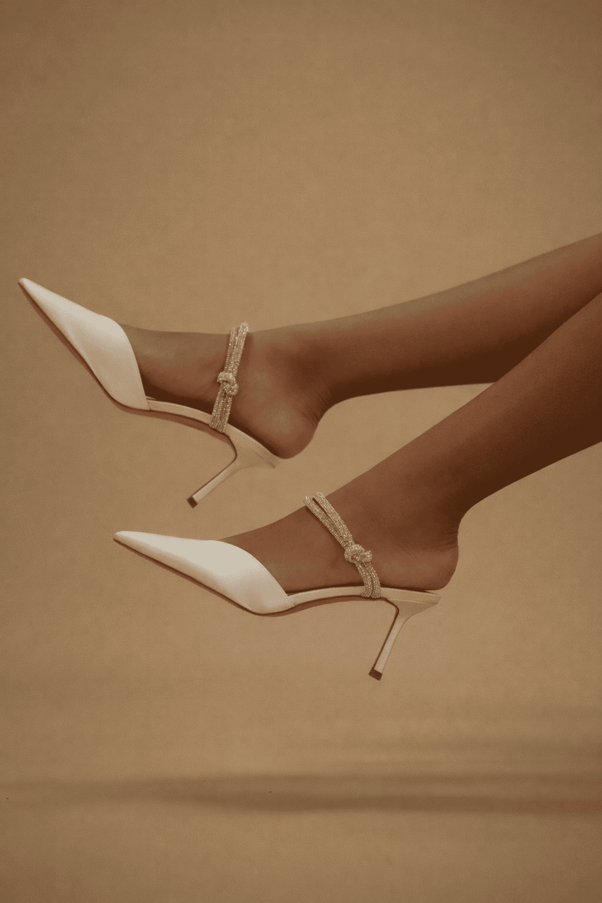 Escarpins blancs à bout pointu, avec un talon fin et une bride délicate ornée de strass autour de la cheville ou derrière le talon.