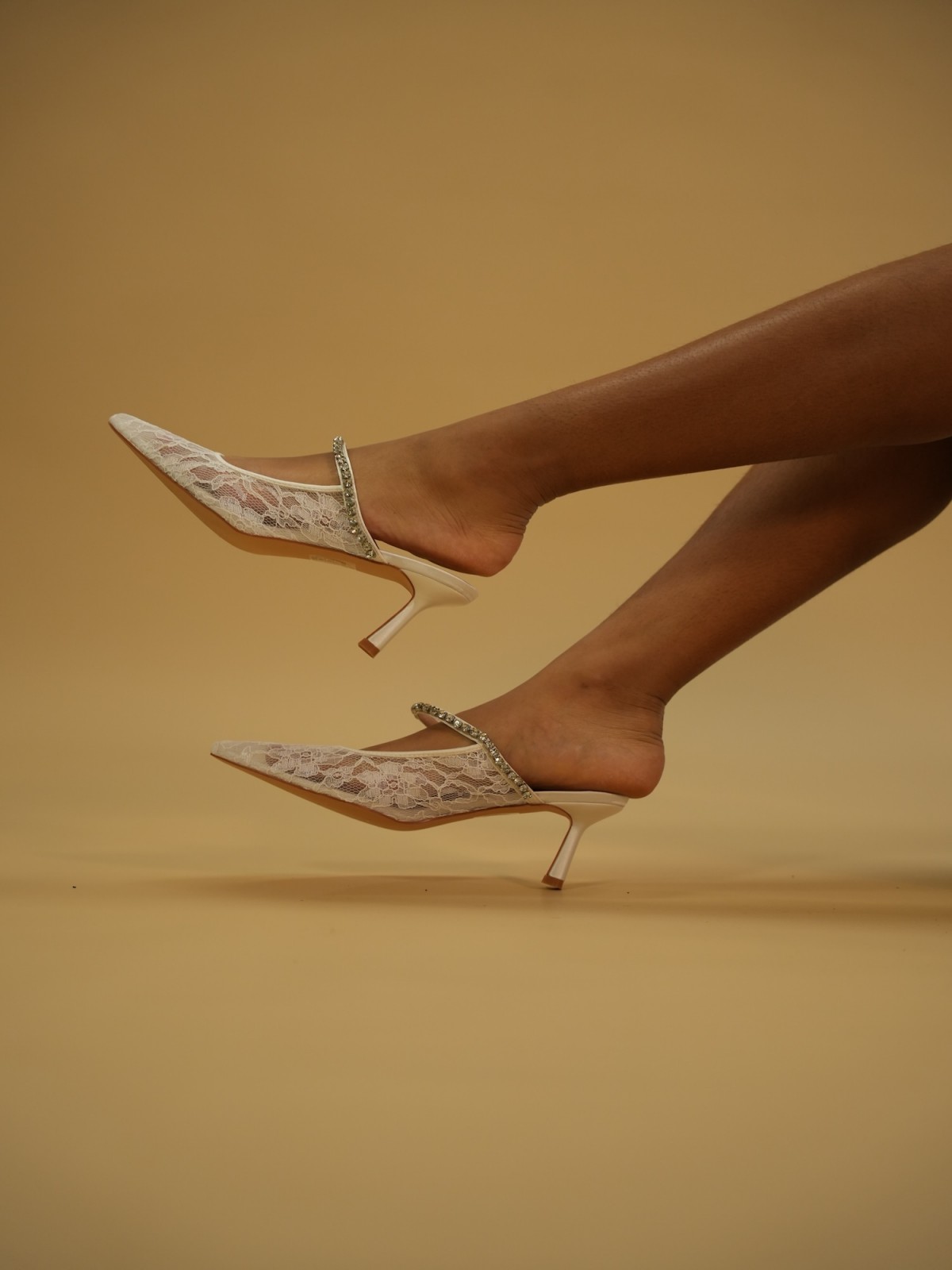 Escarpins blancs à talon fin, en dentelle, ouverts à l’arrière, avec une bride délicatement ornée de strass.