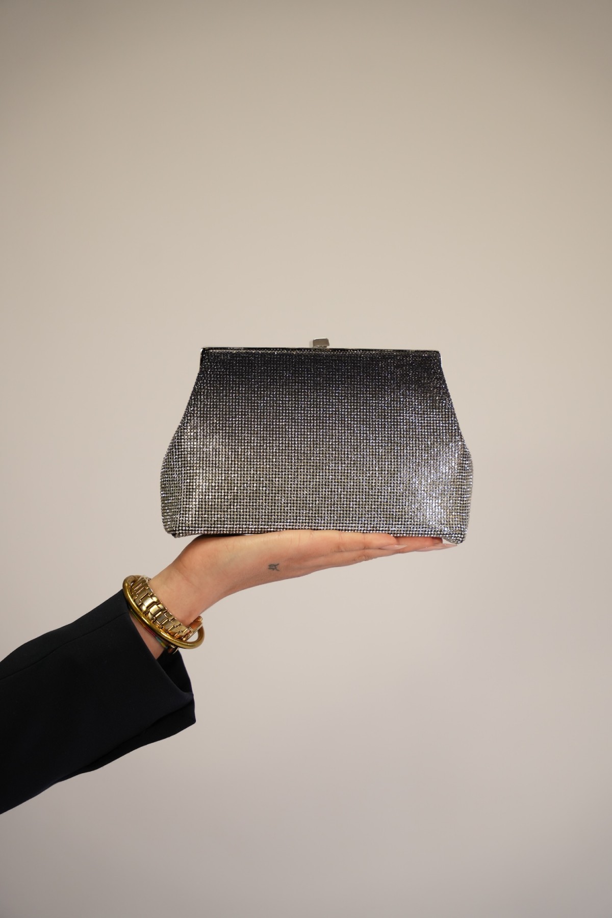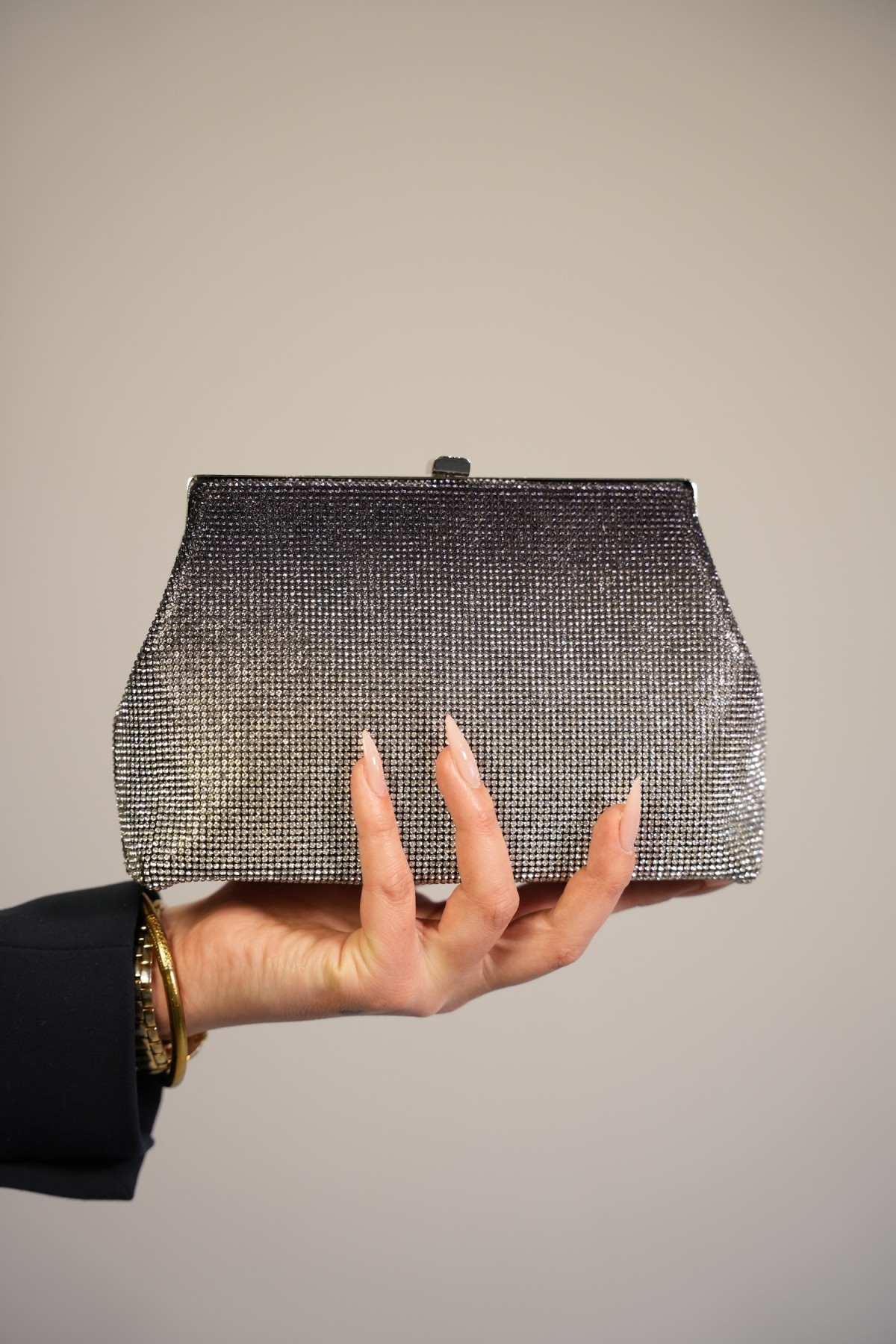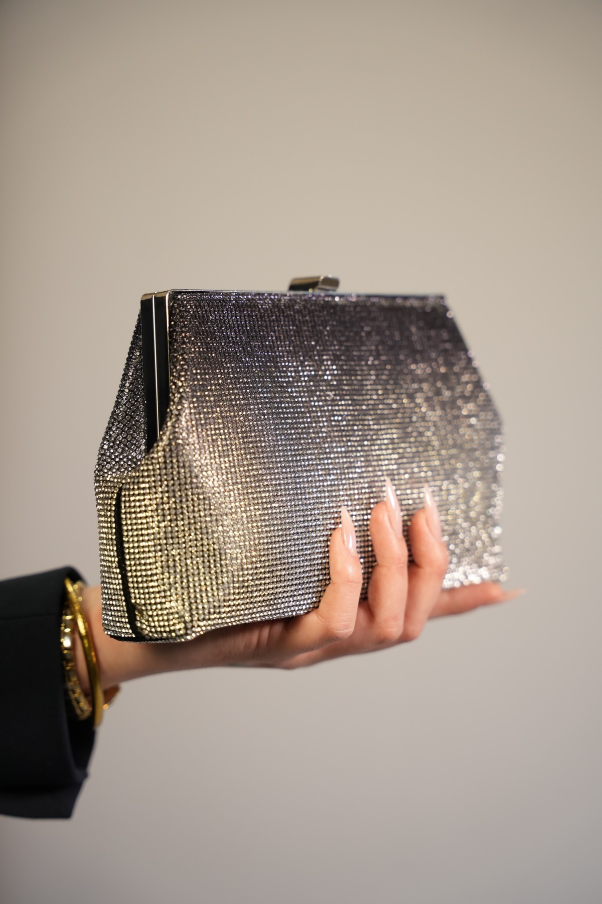 Pochette dégradée à strass noir et argentée, avec une chaine argentée.
