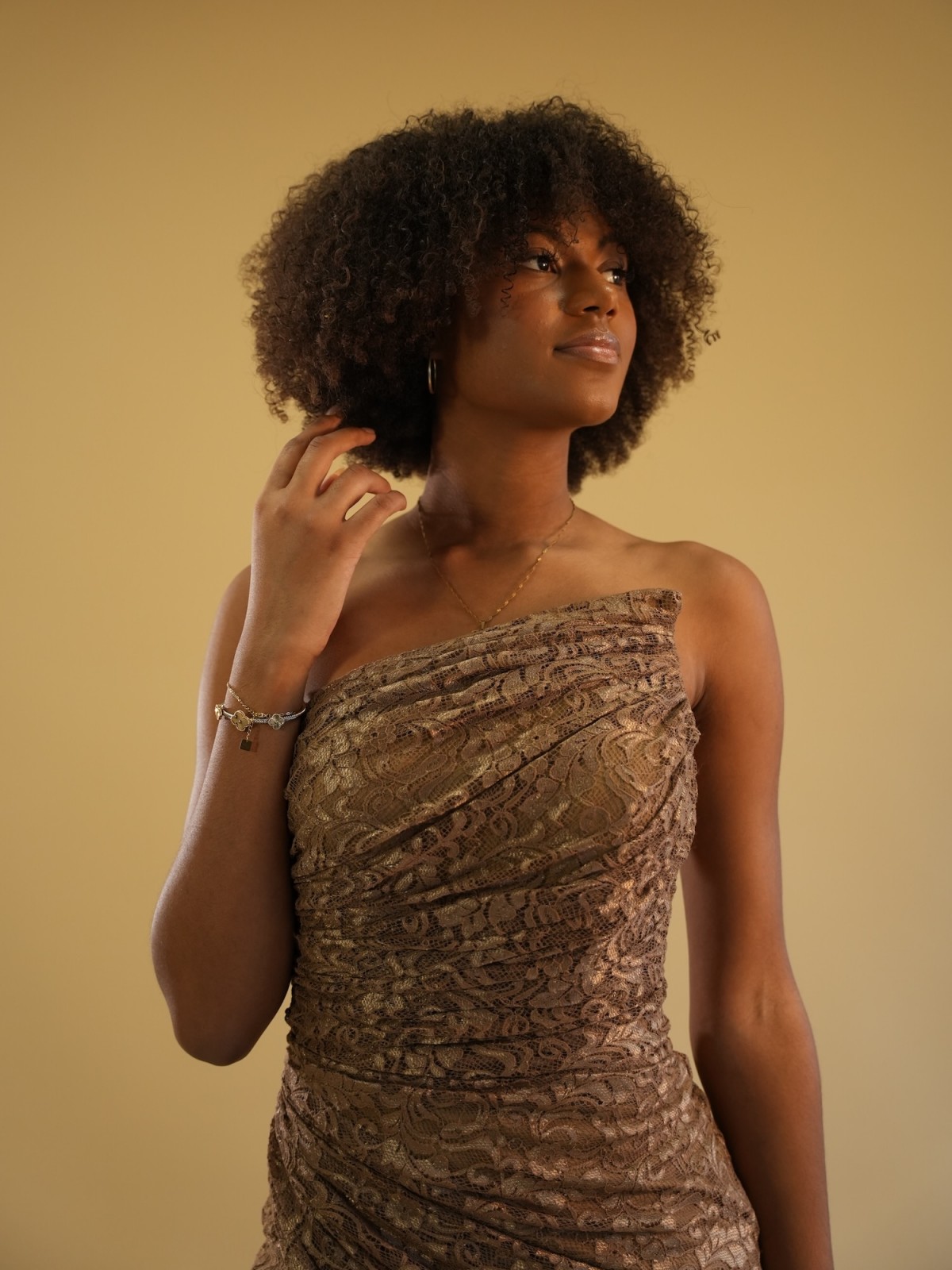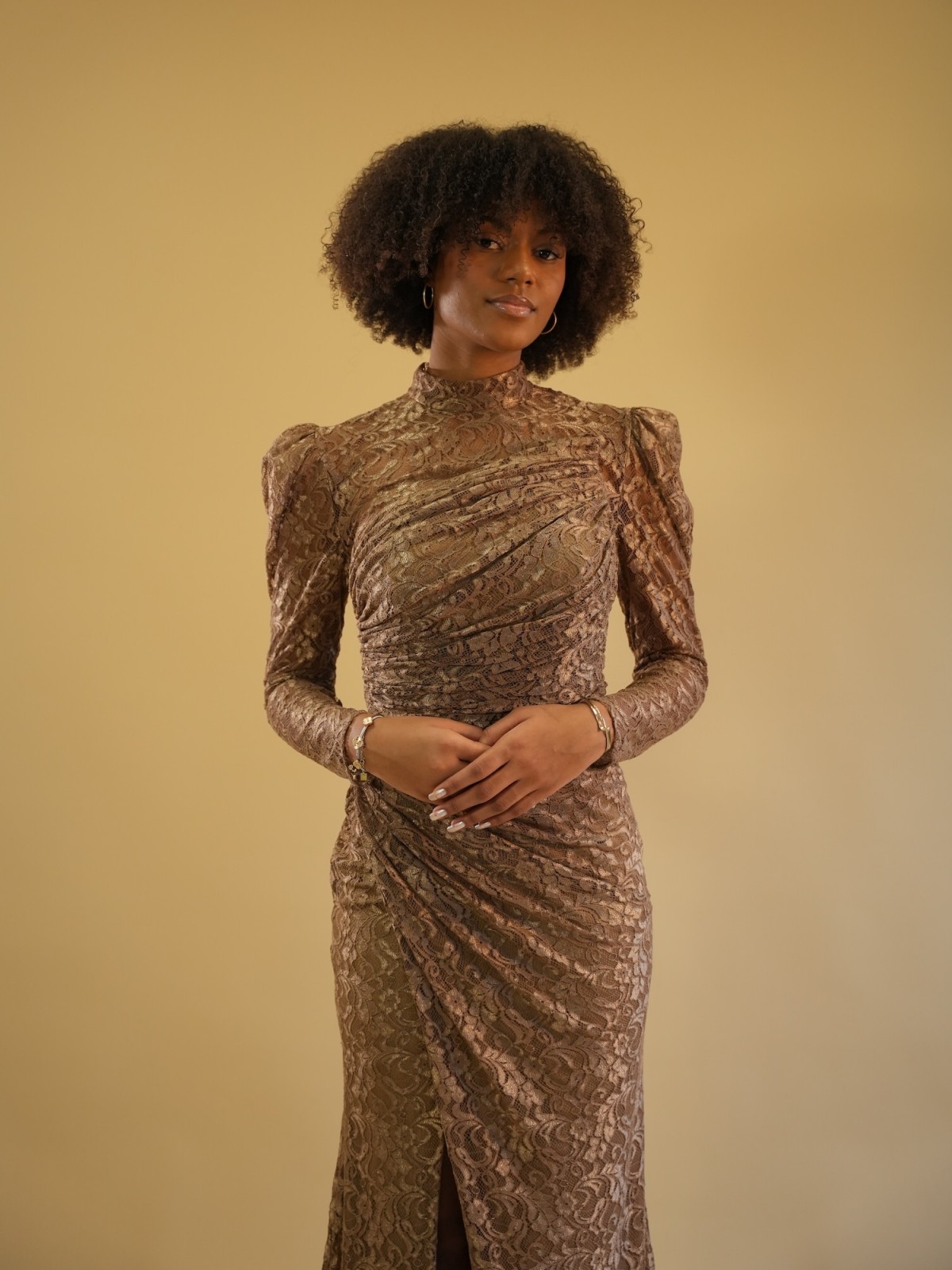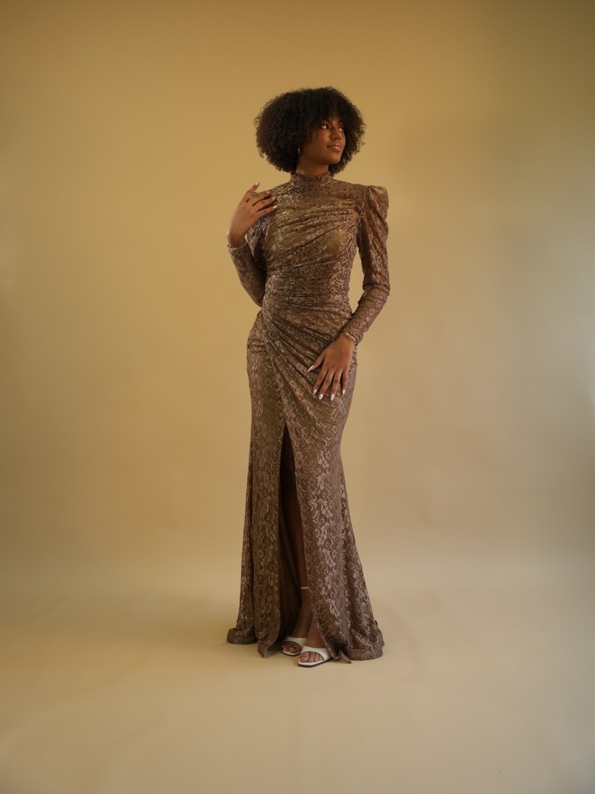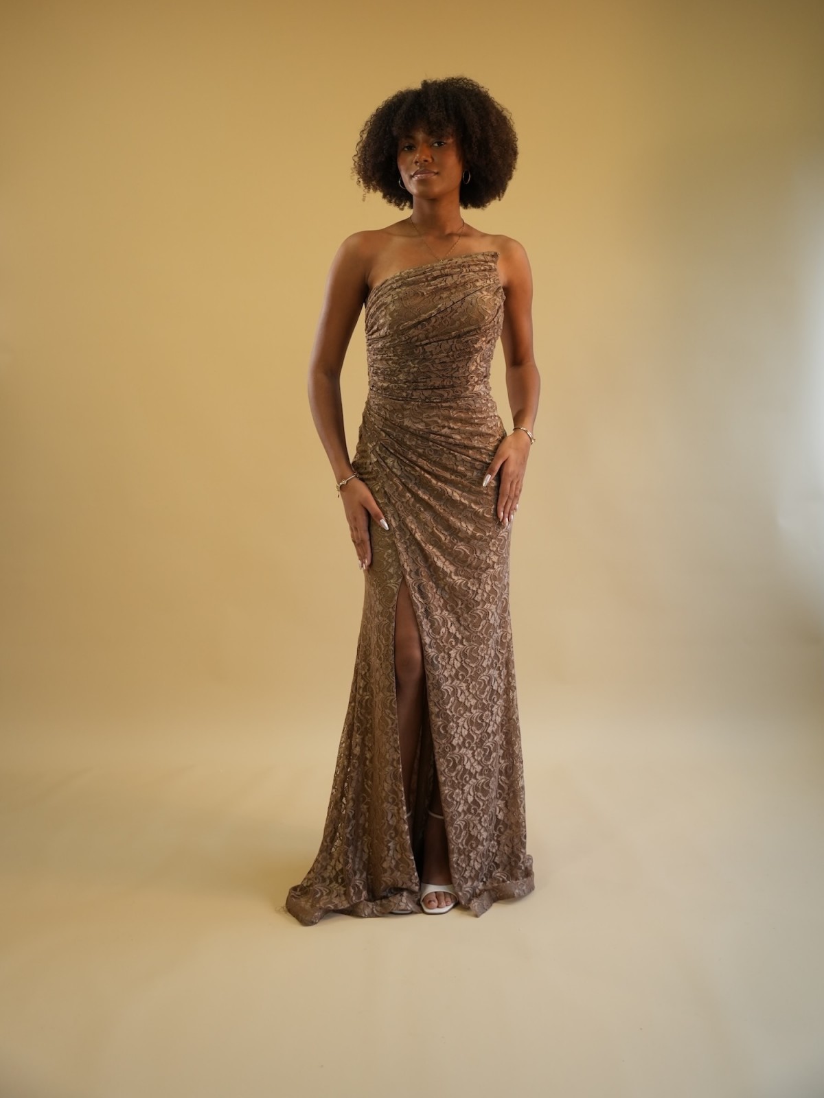 Robe longue en dentelle aux tons chauds, sublimée par un drapé structuré et une fente délicate. Sa coupe ajustée et son encolure asymétrique mettent en valeur la silhouette avec élégance et modernité.