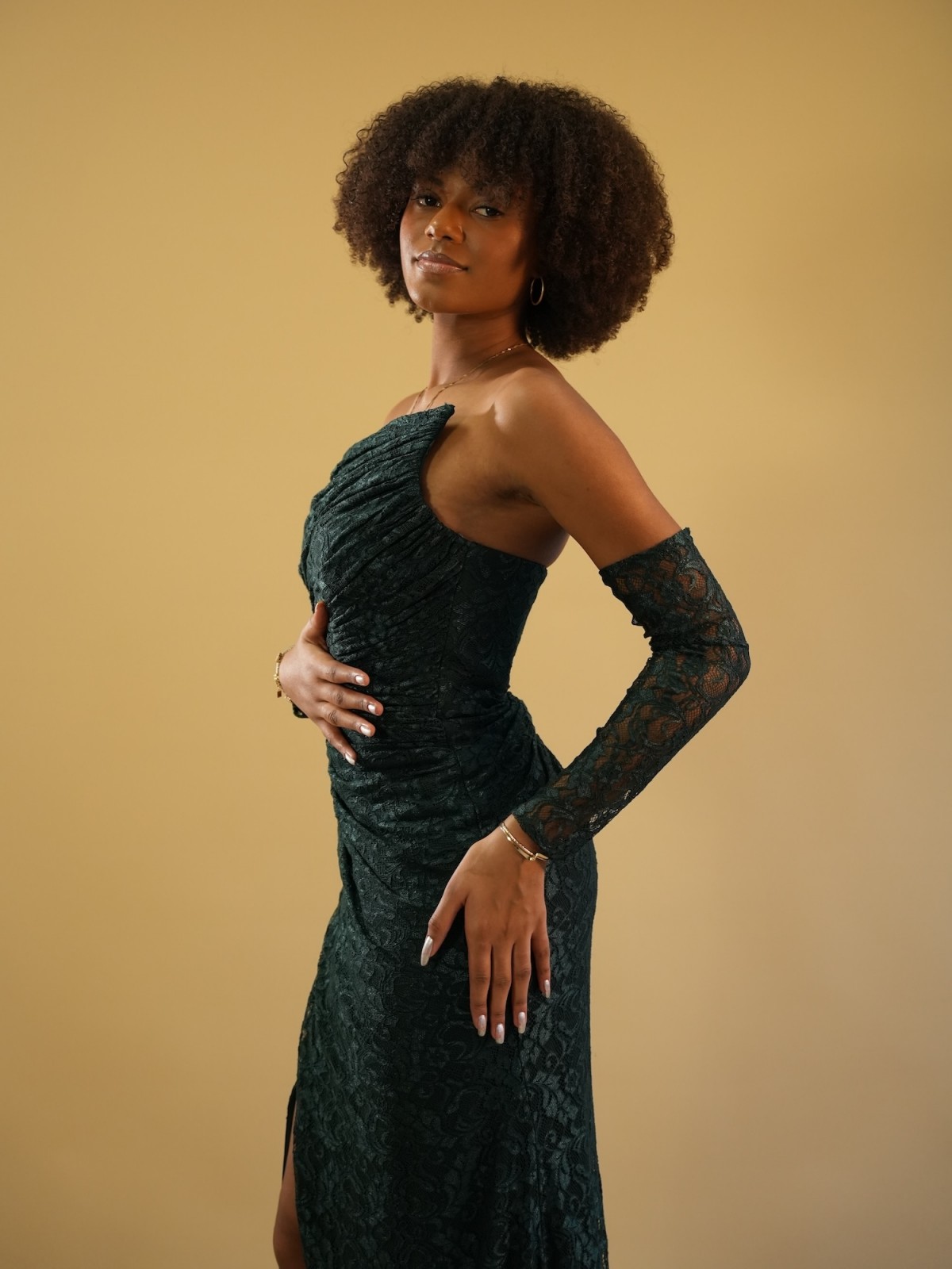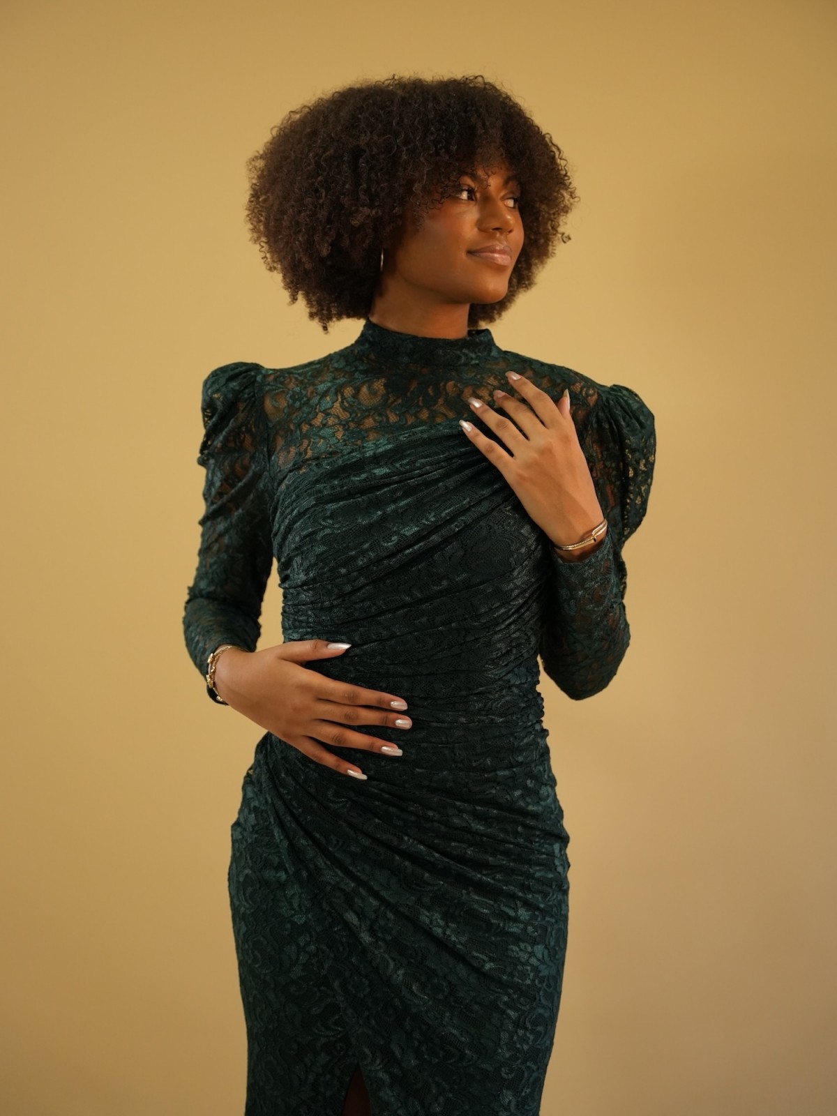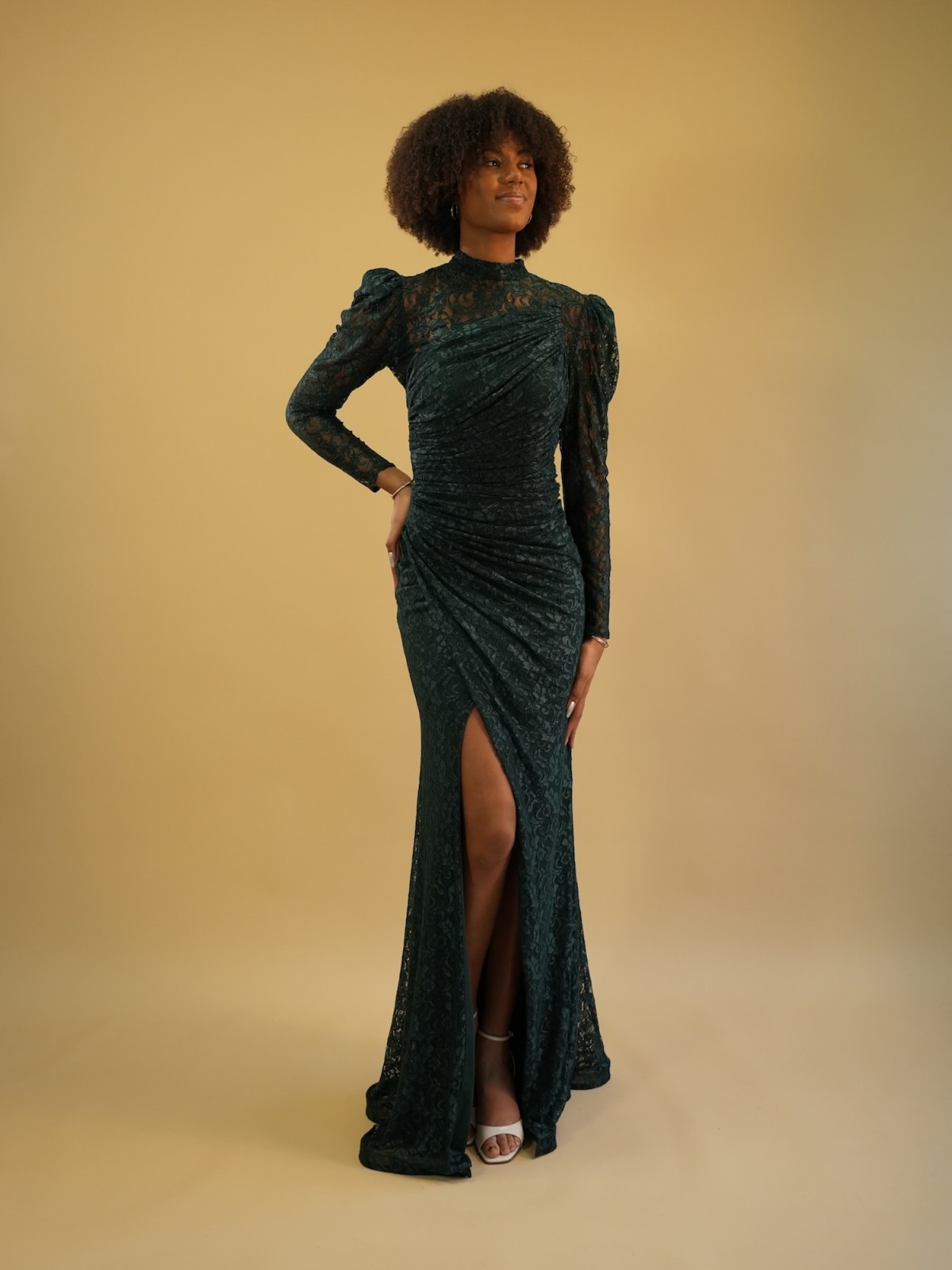 Robe longue en dentelle vert profond à la coupe ajustée, sublimée par un bustier épaules dénudées, un drapé délicat et une fente élégante pour une allure féminine et raffinée.