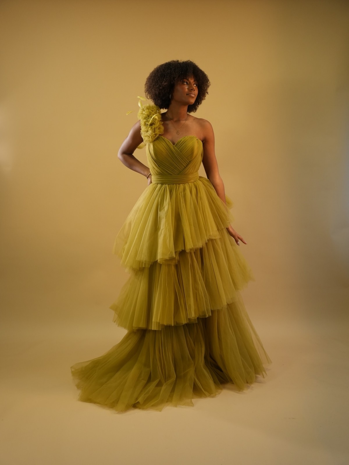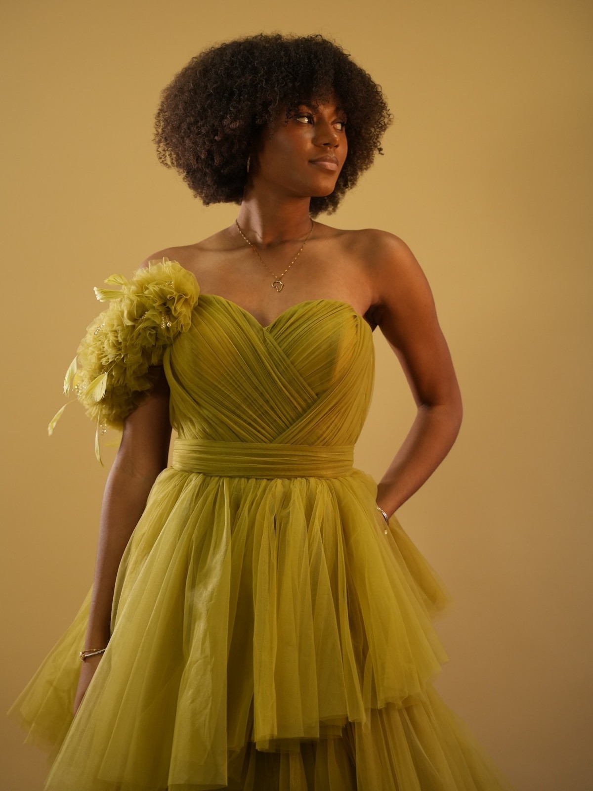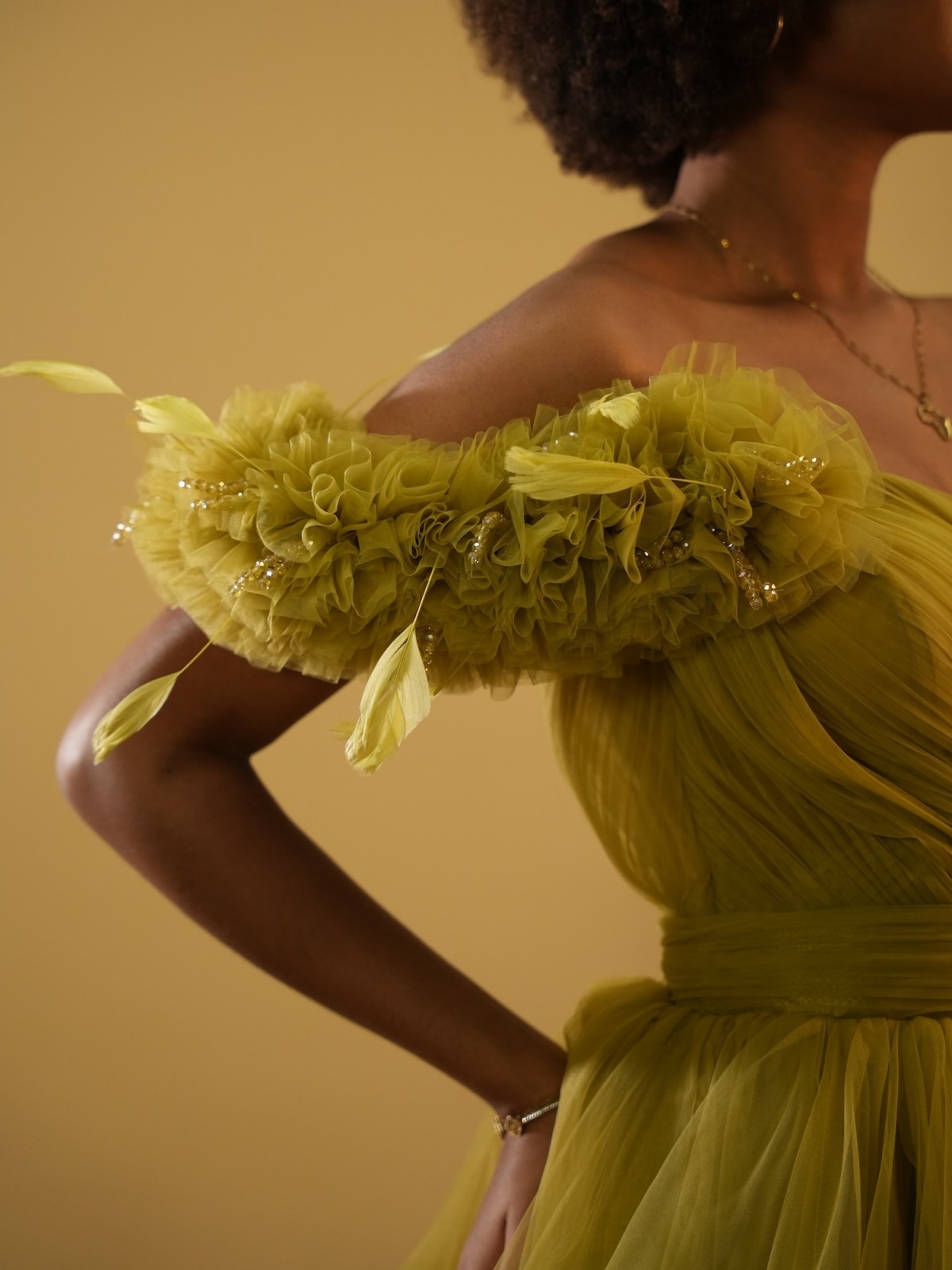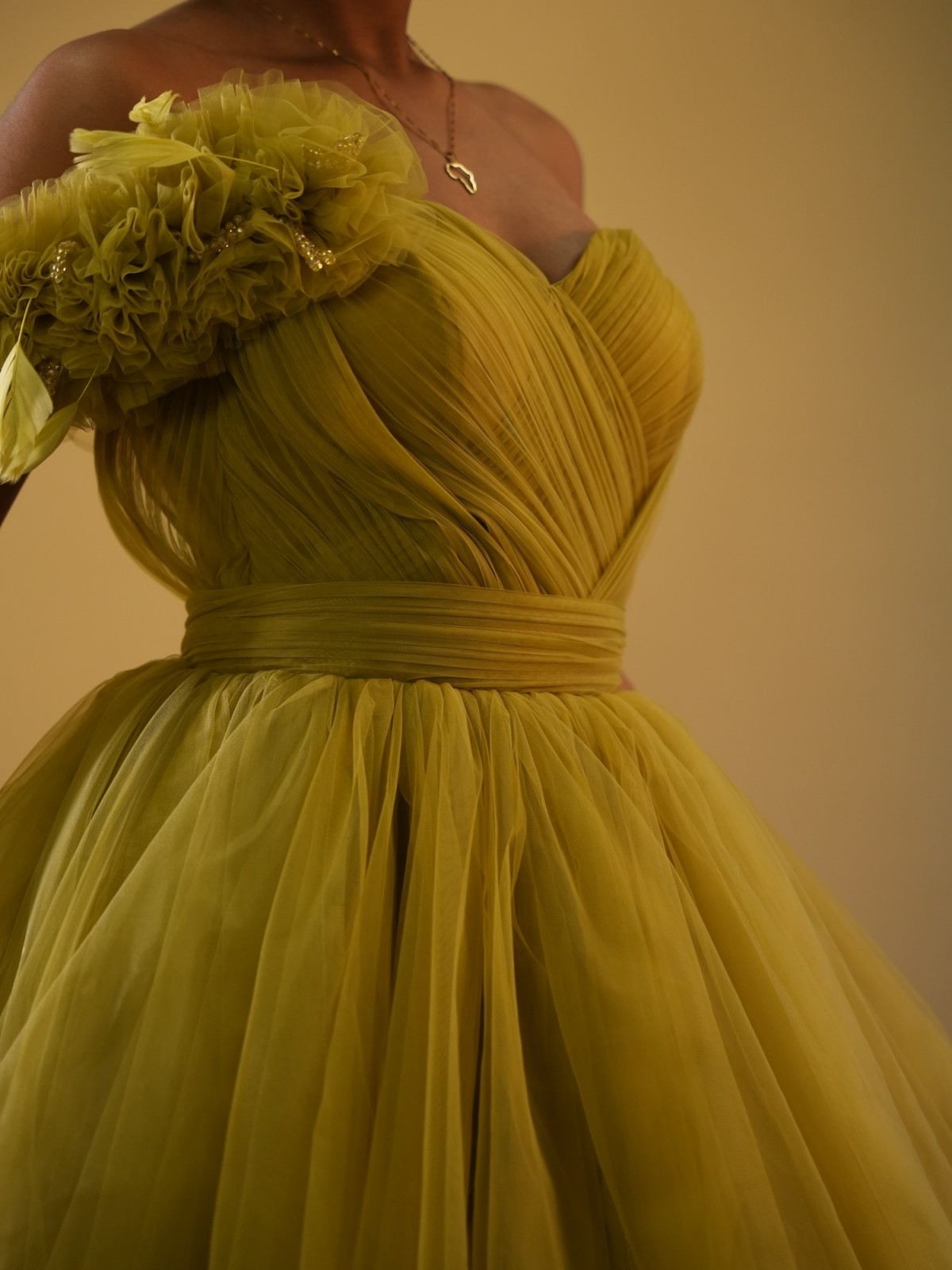 Robe longue en tulle, avec détails épaule asymétrique - vert anis