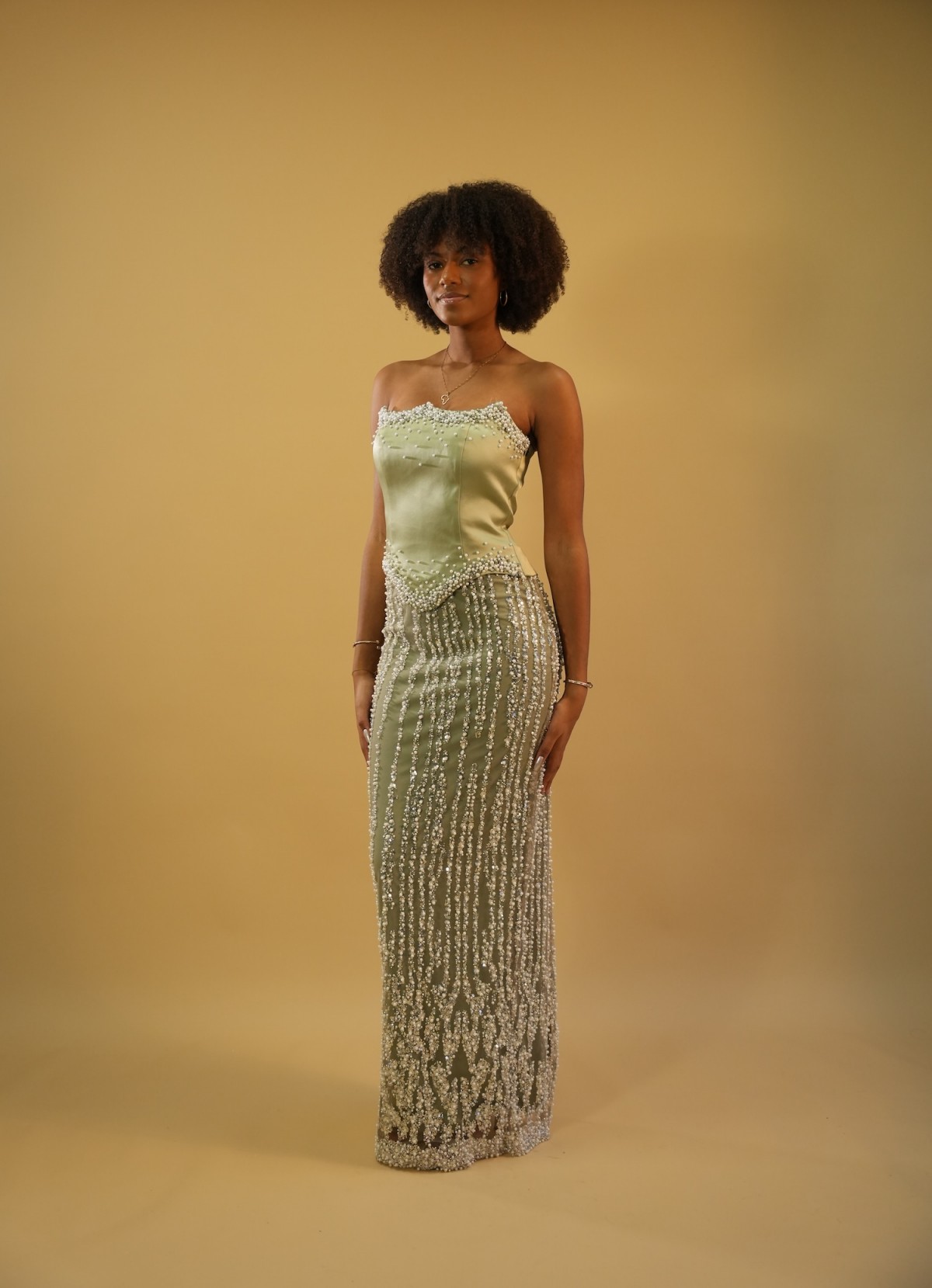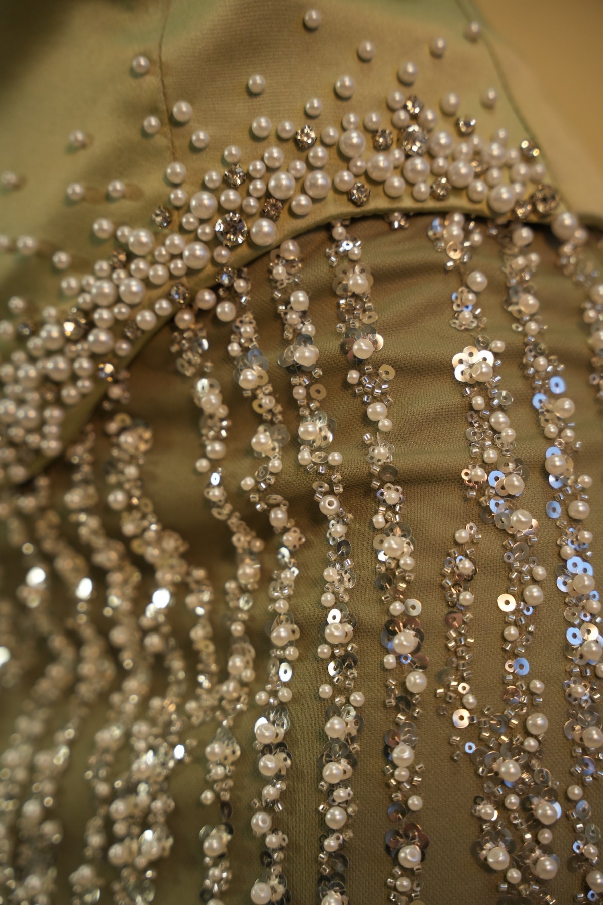 Robe longue en tulle, avec détails épaule asymétrique - vert anis