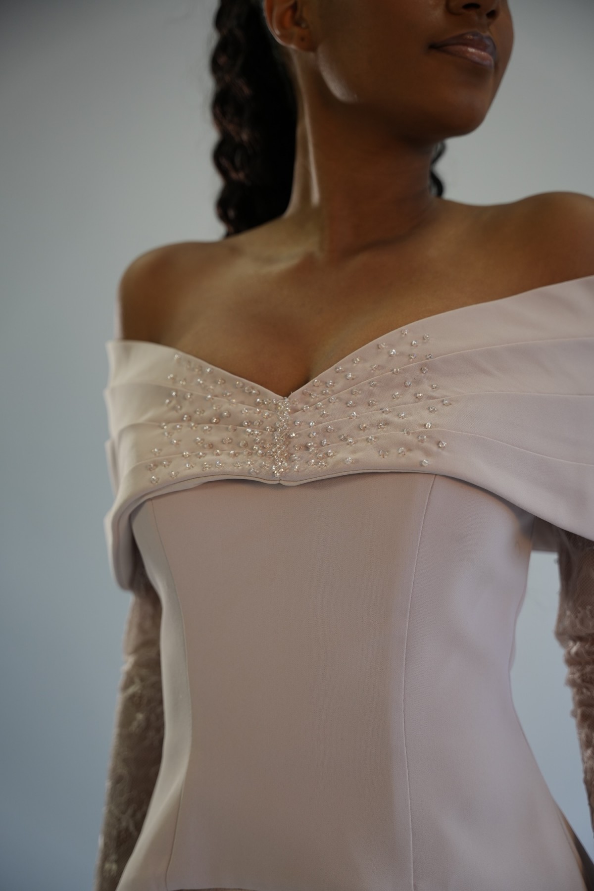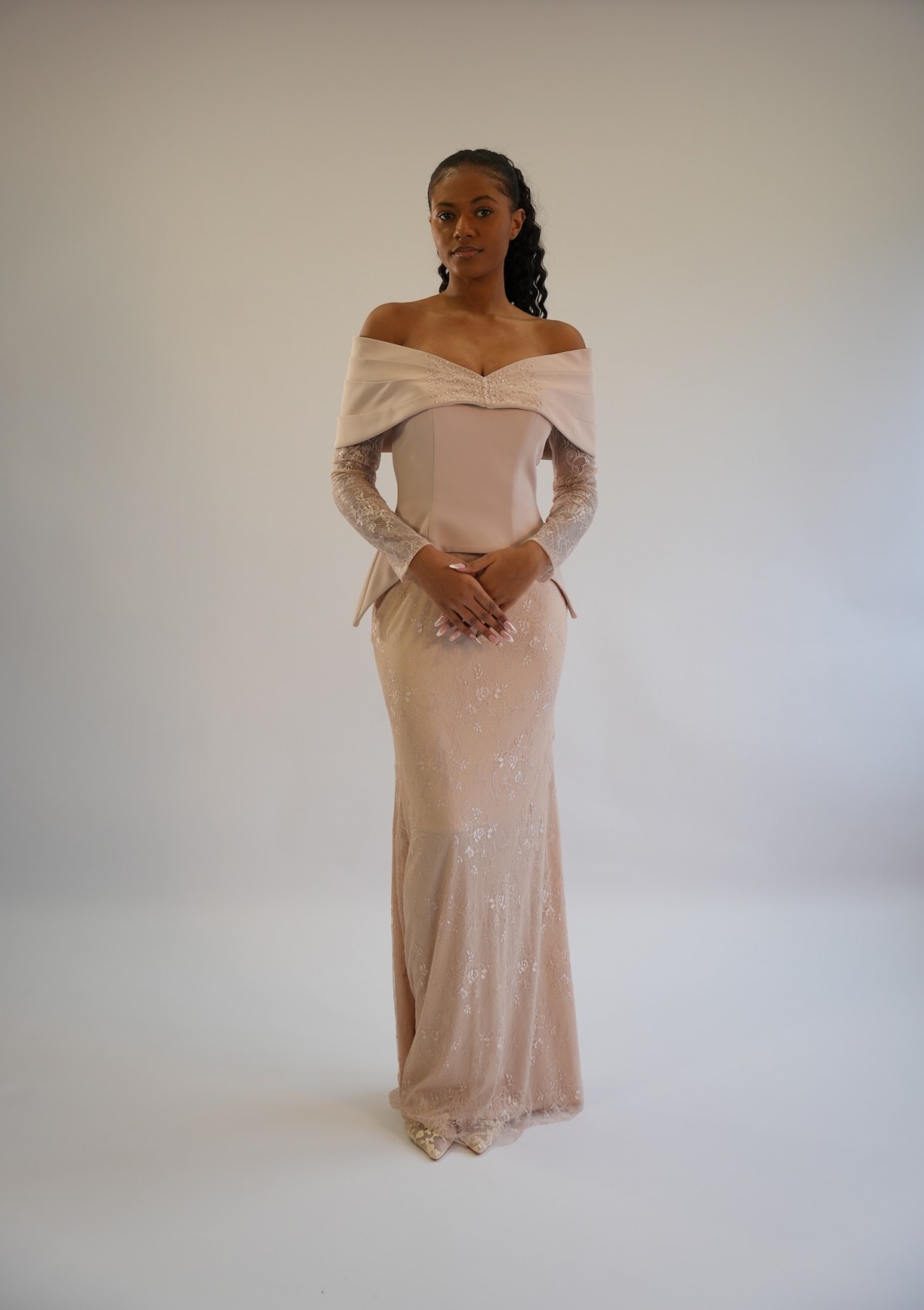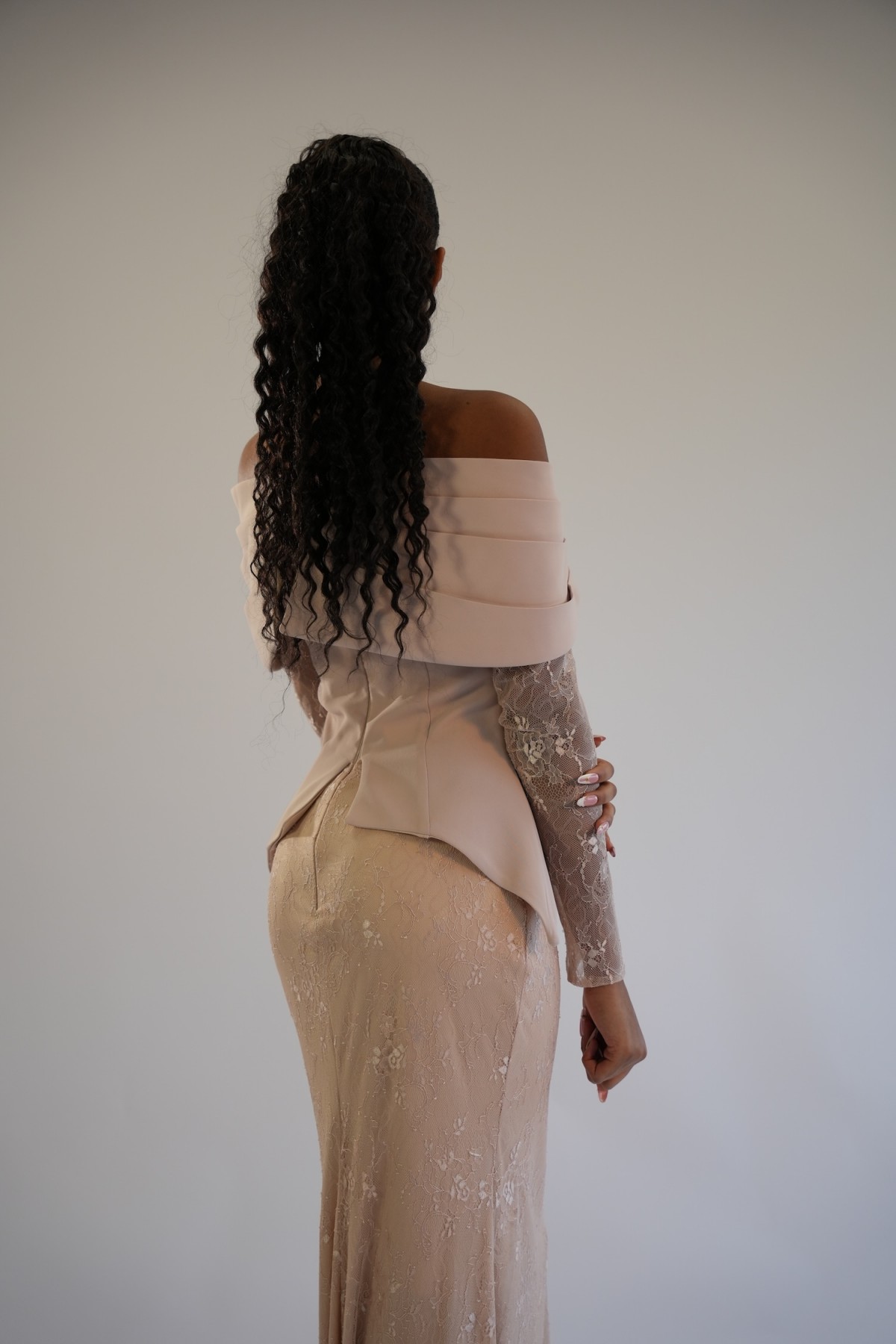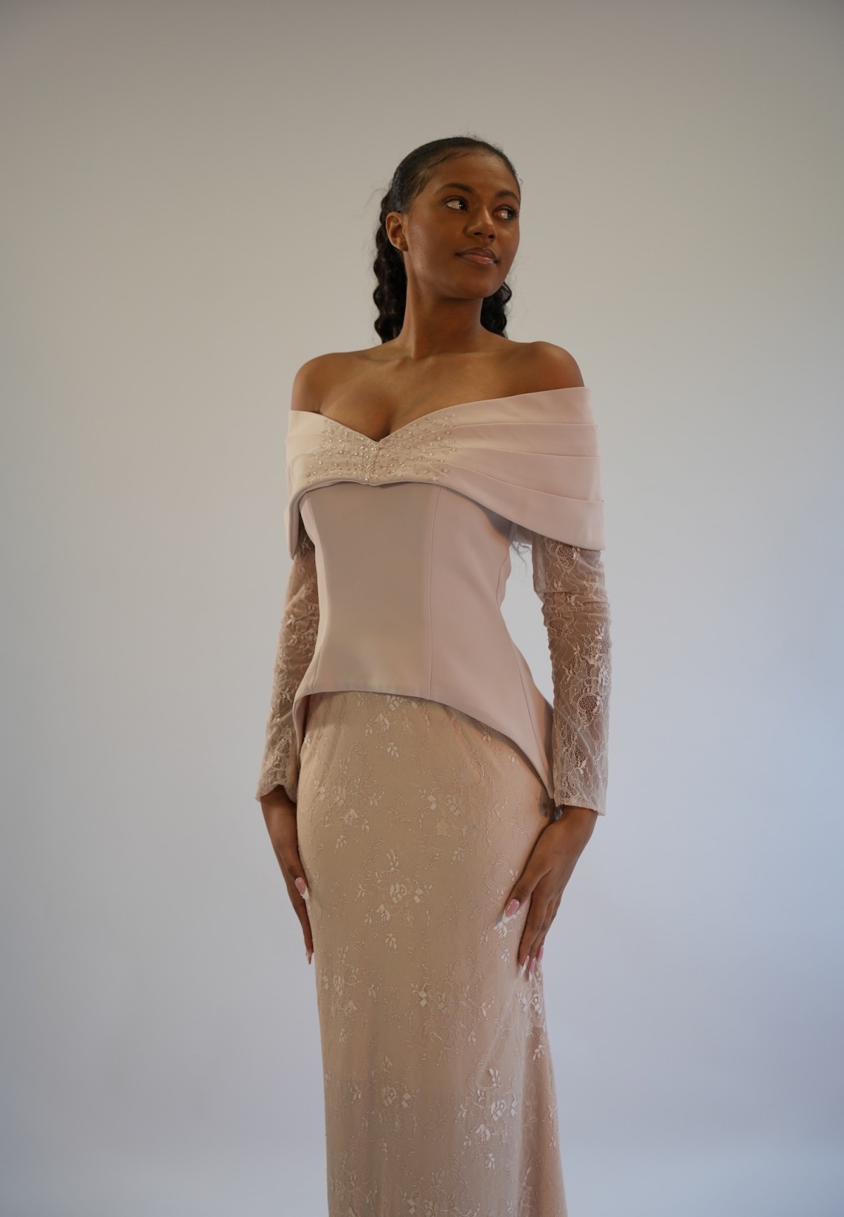 Robe longue nude à l’allure élégante, mêlant un bustier structuré à une jupe en dentelle délicate. Sa coupe fluide et ses manches raffinées subliment la silhouette avec douceur.