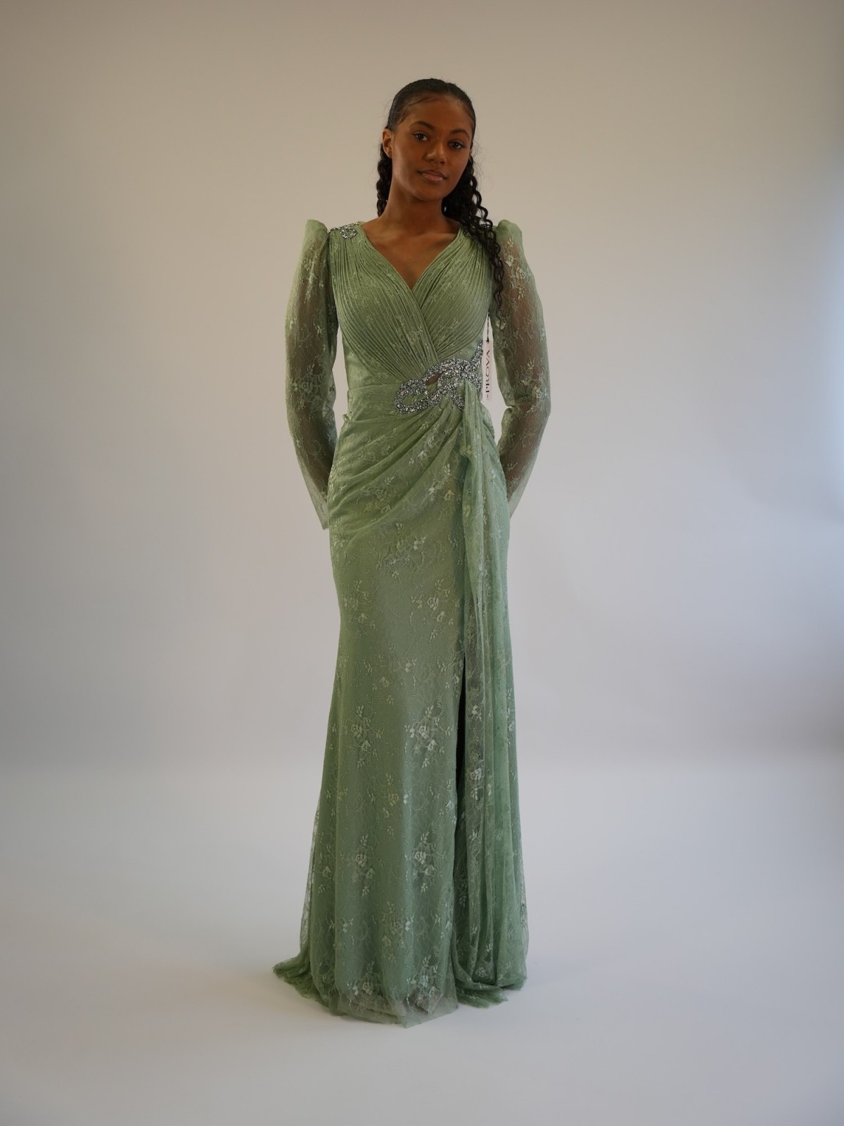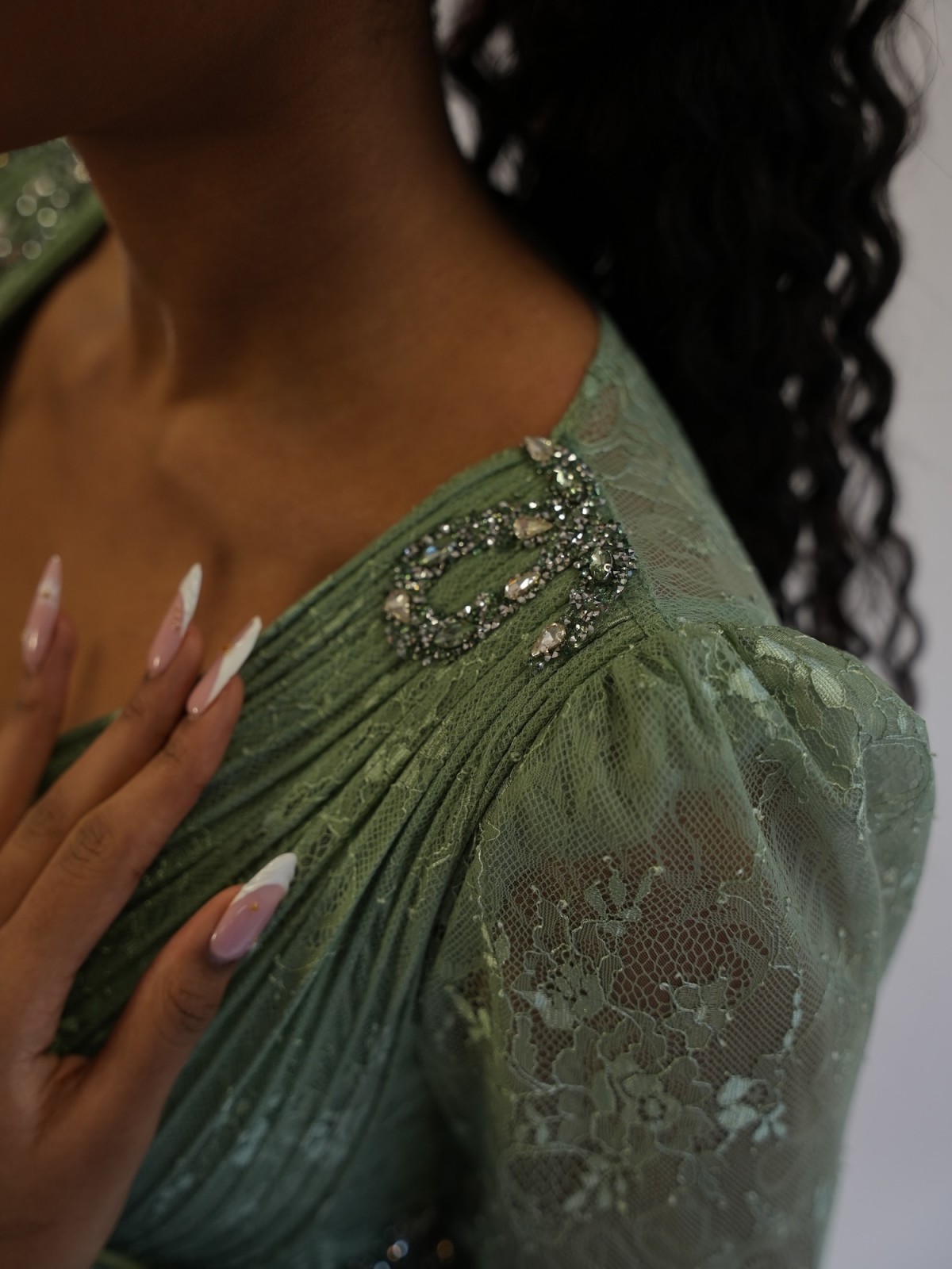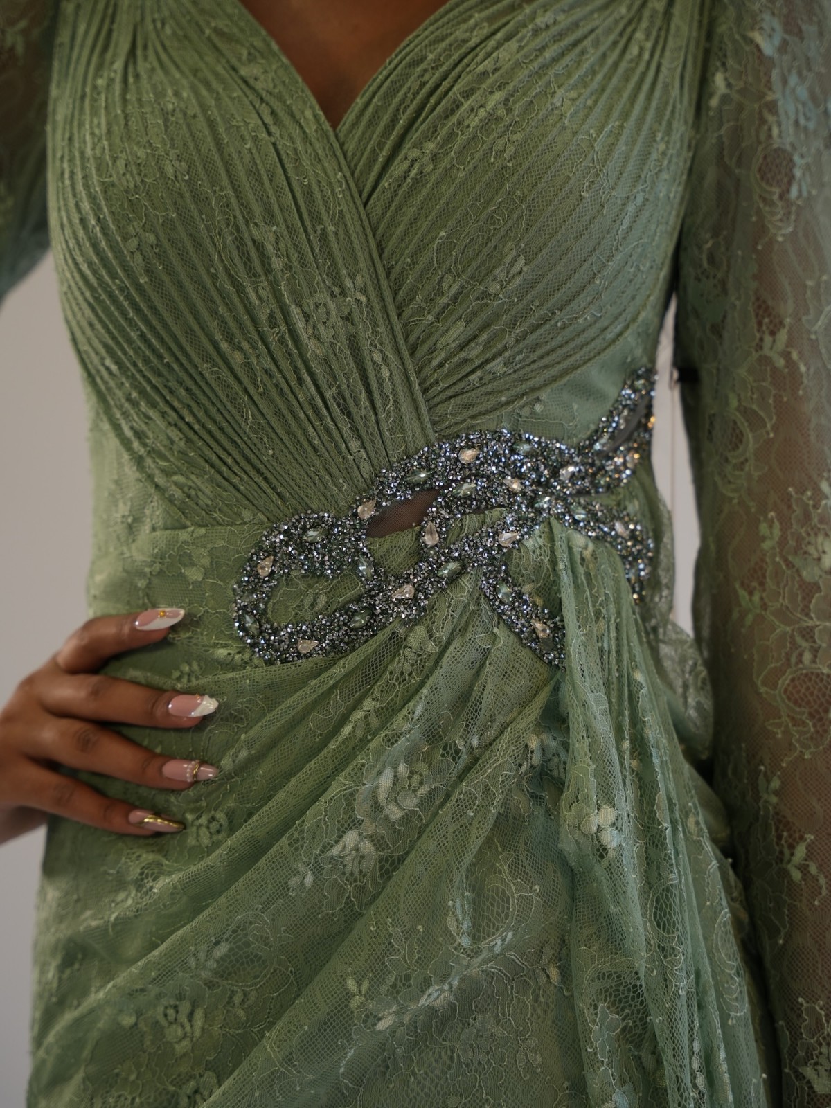 Robe longue vert sauge à la coupe fluide, sublimée par une dentelle délicate et des manches transparentes. Son col en V croisé et son drapé à la taille apportent une touche élégante qui met la silhouette en valeur avec naturel.