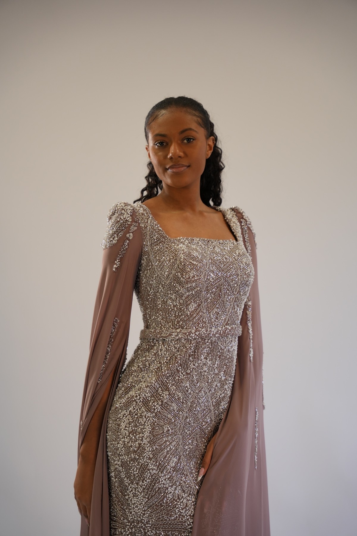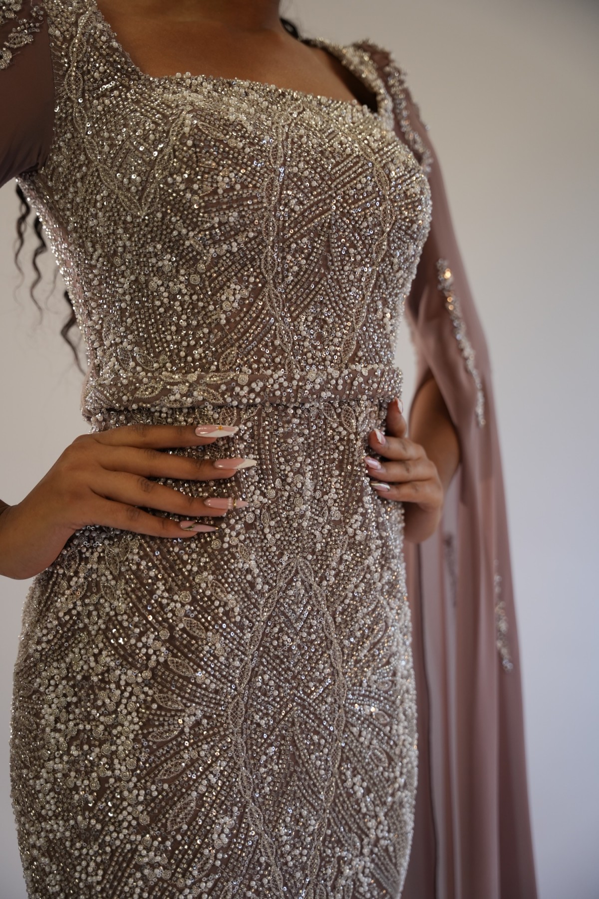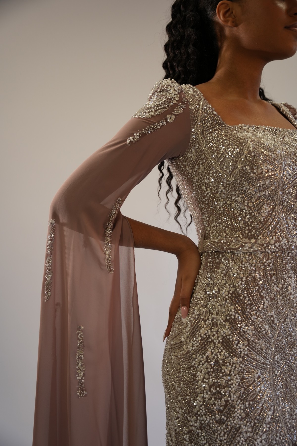 Son somptueux travail de perles illumine la silhouette tandis que les manches fluides façon cape apportent légèreté et mouvement couleur champagne.