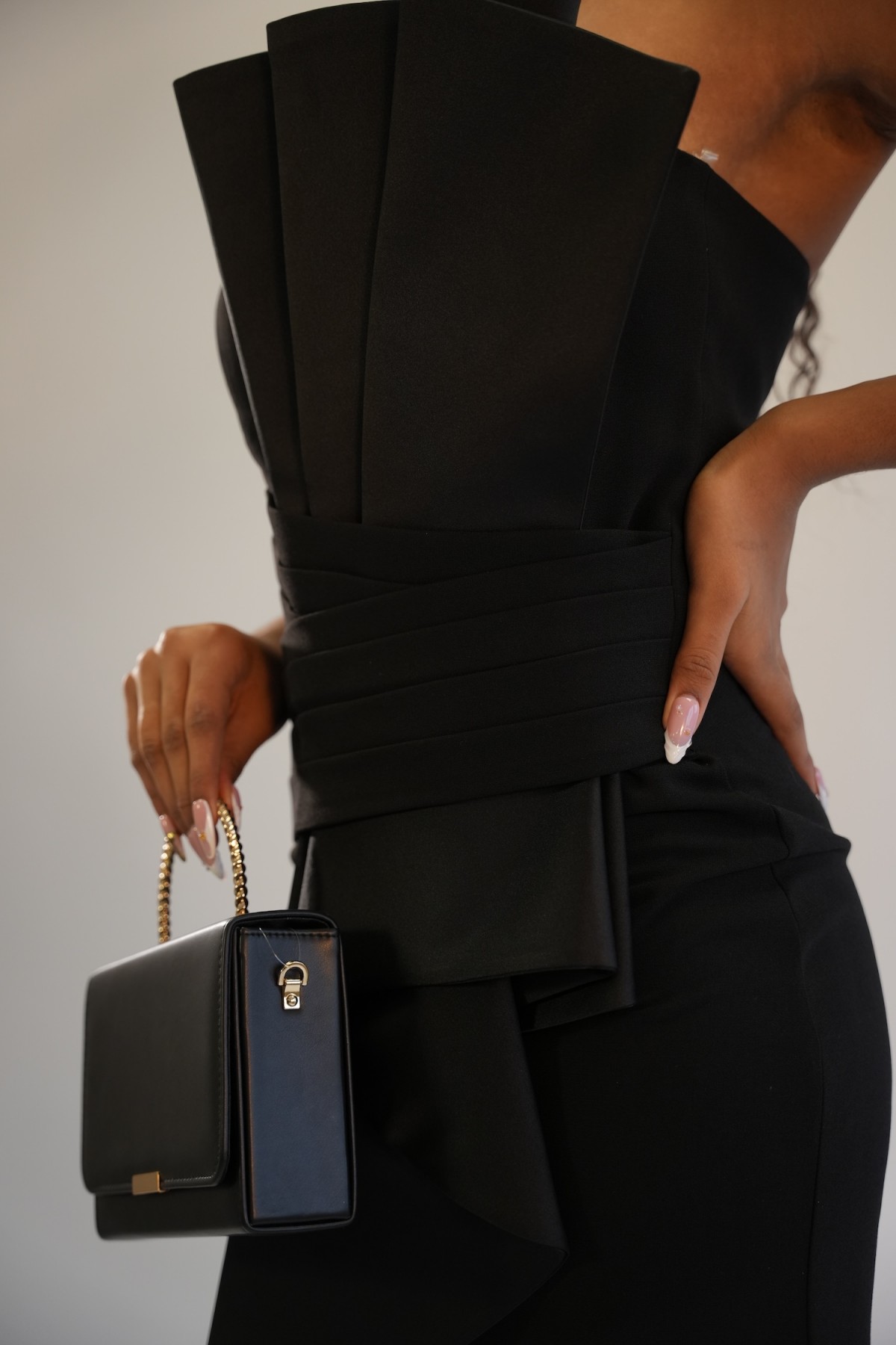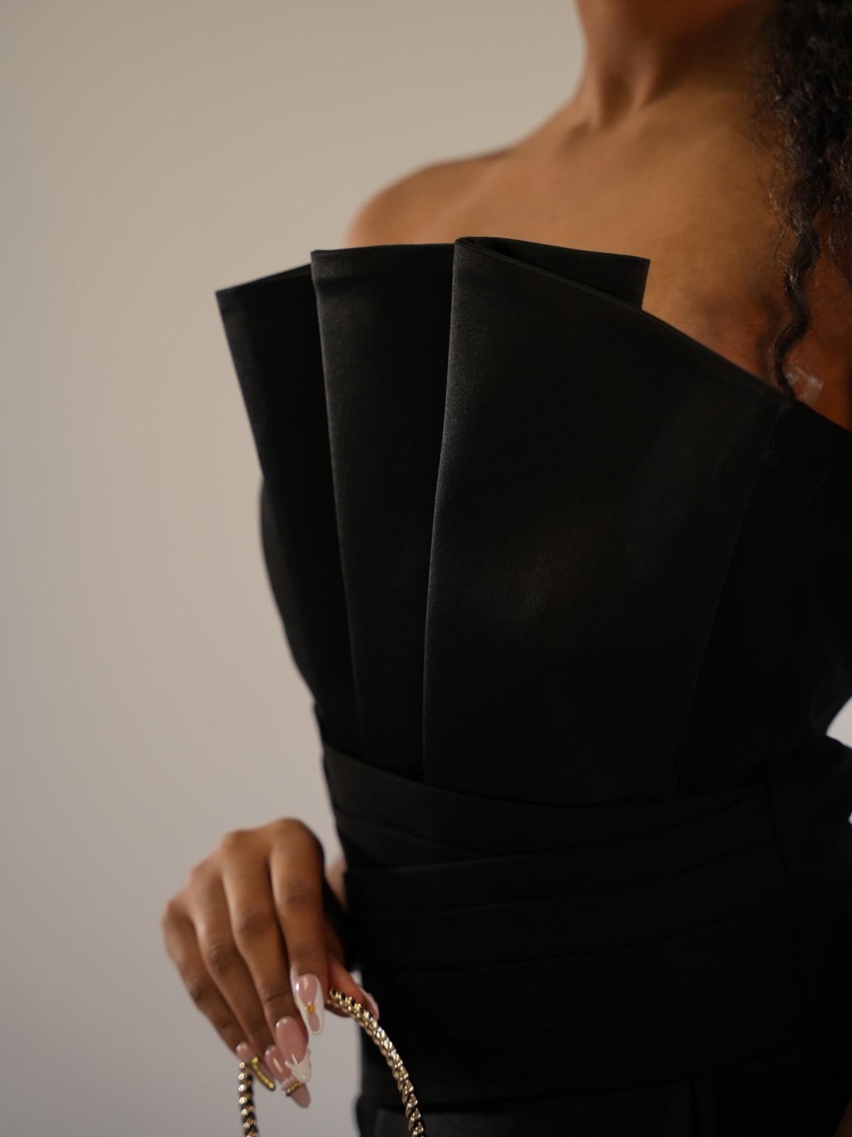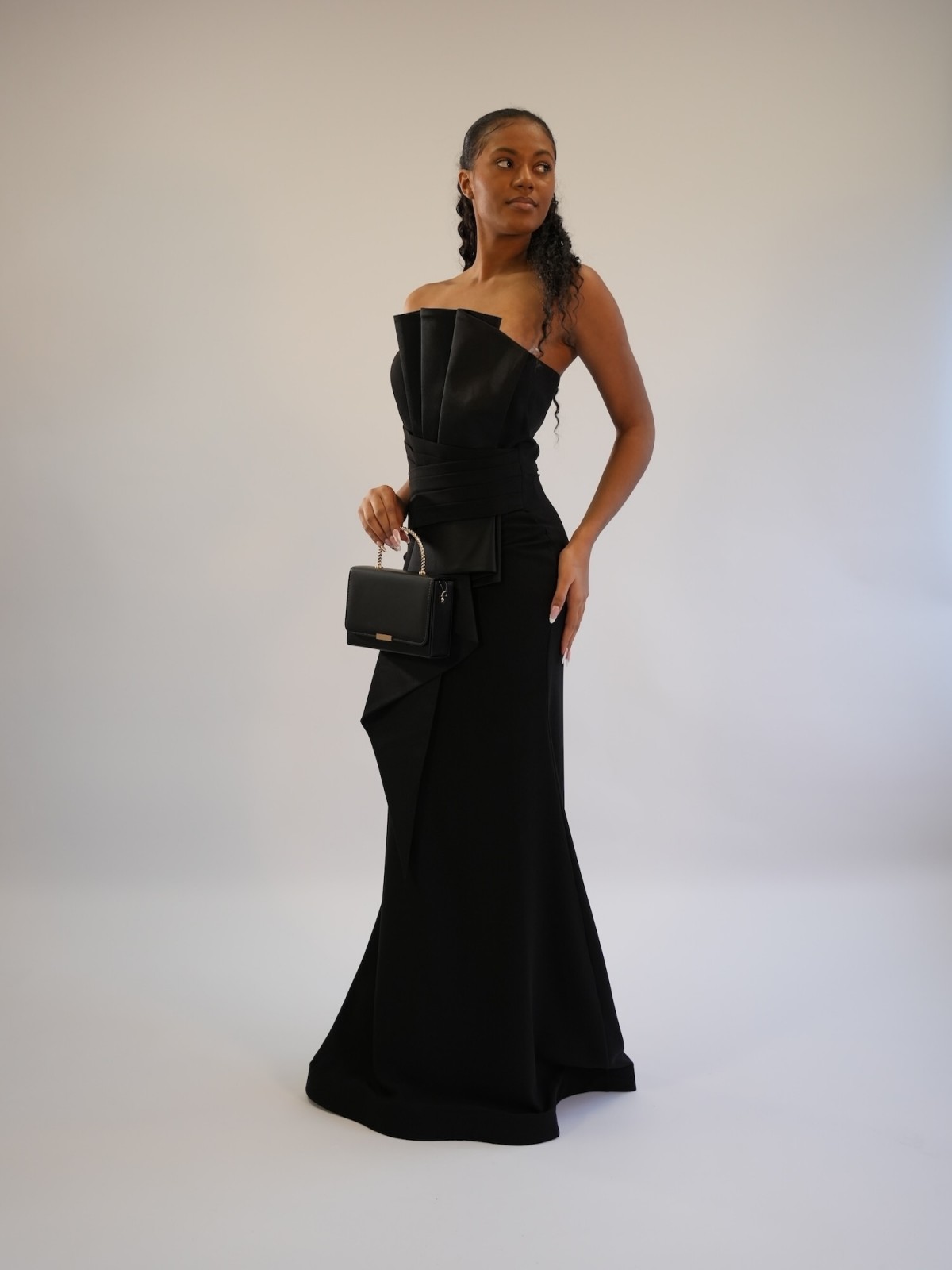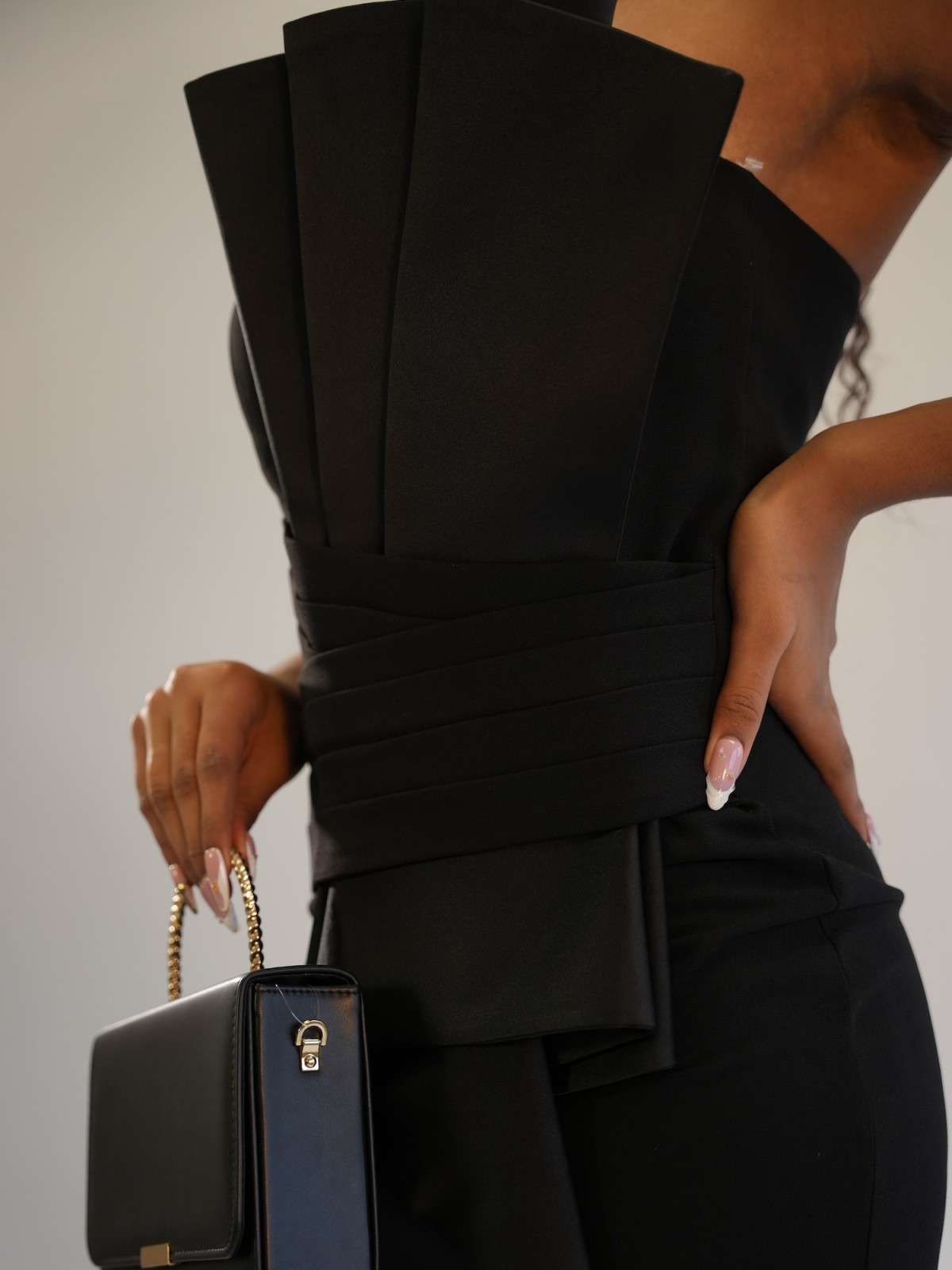 La robe Milan séduit par sa structure architecturale et son élégance minimaliste. Son bustier sculptural et sa coupe nette offrent une allure moderne et résolument chic.