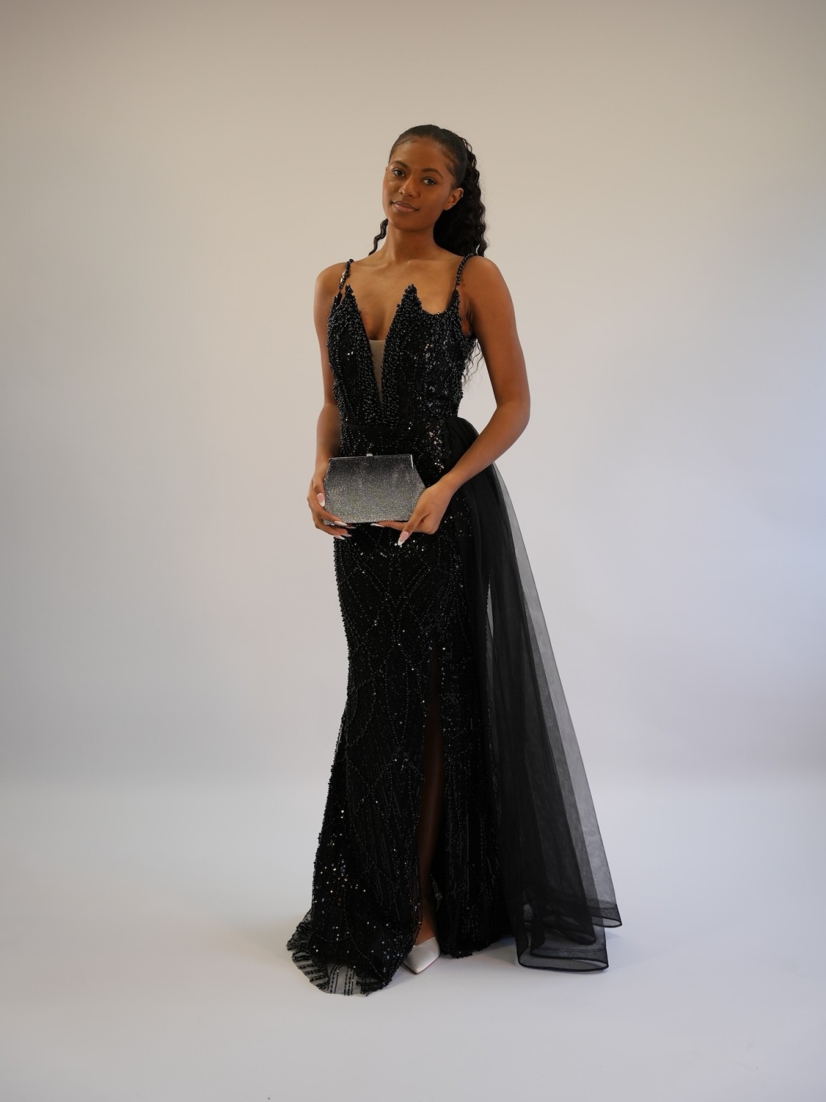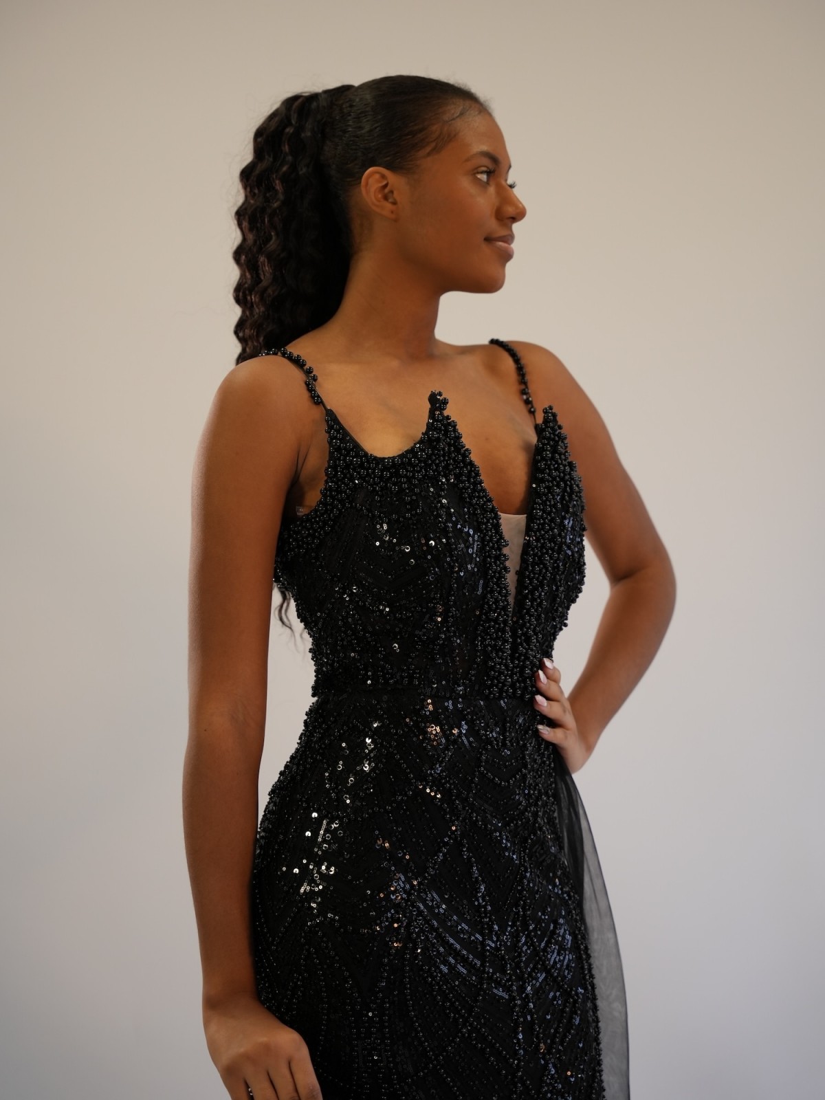 Sa coupe longue et fluide met en valeur la silhouette, tandis que ses sequins et son décolleté apporte une touche audacieuse.