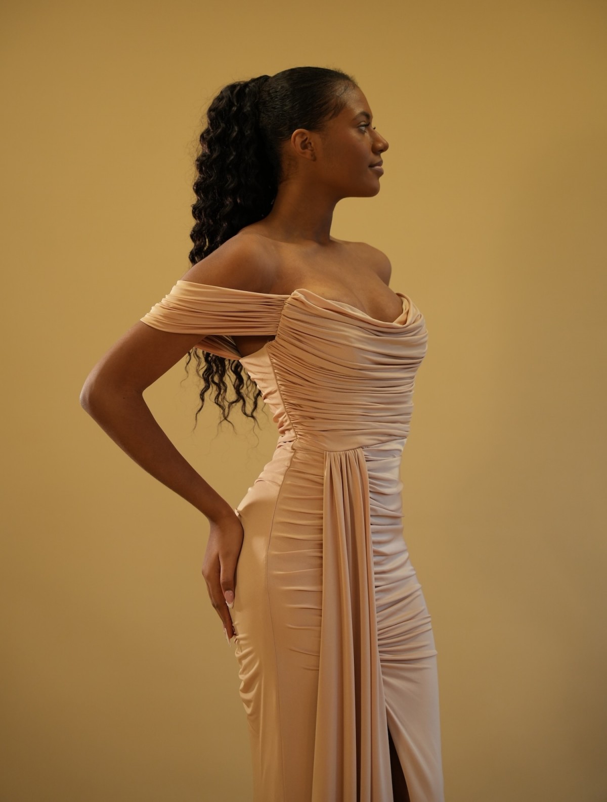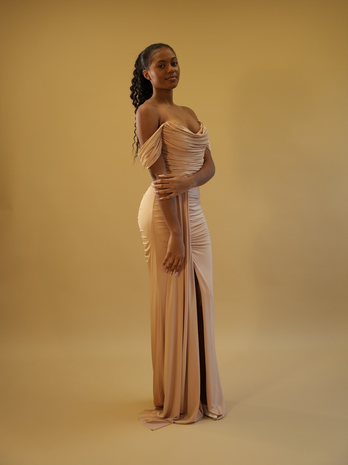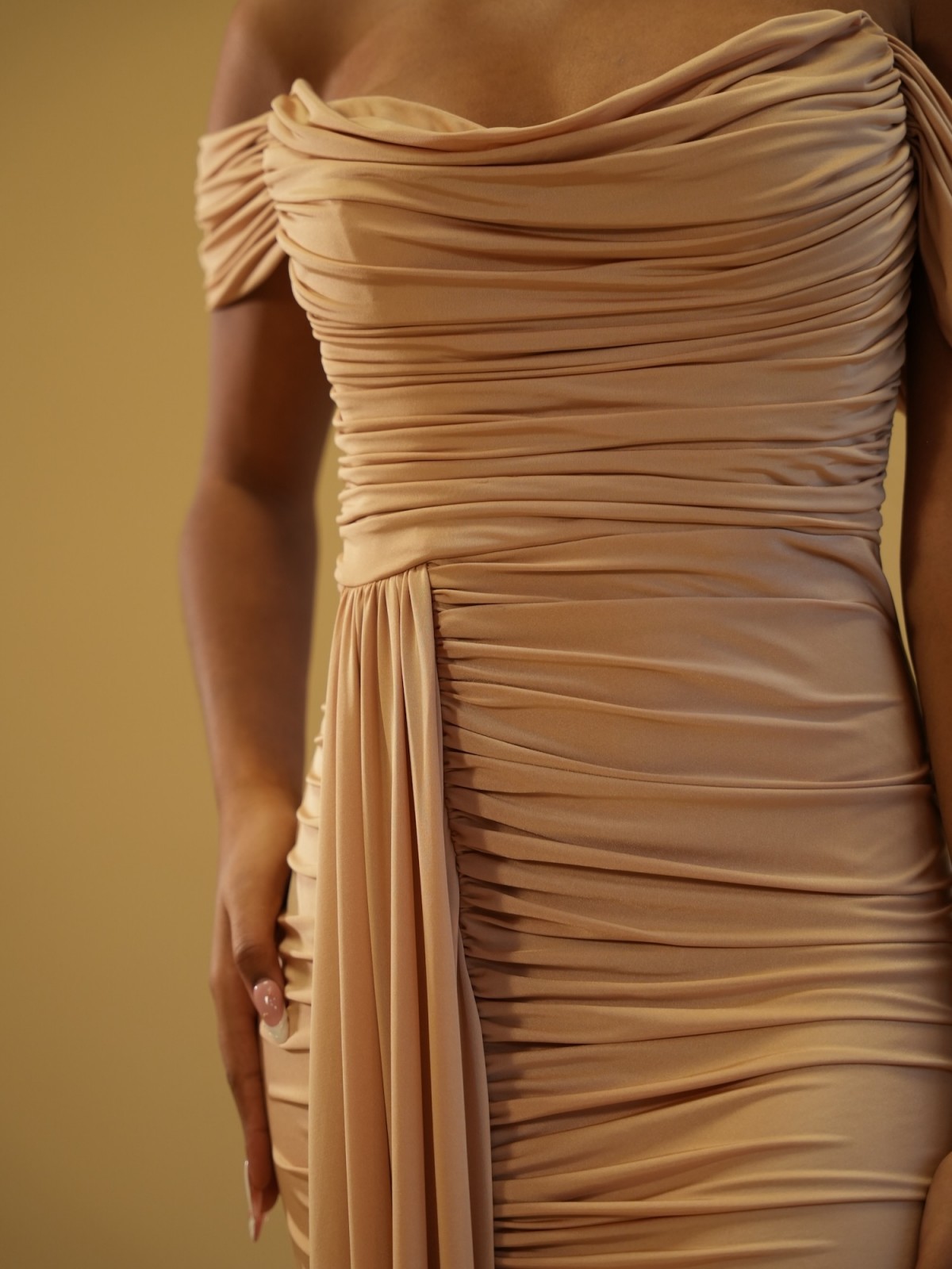 Robe longue drapée épaules dégagées - nude