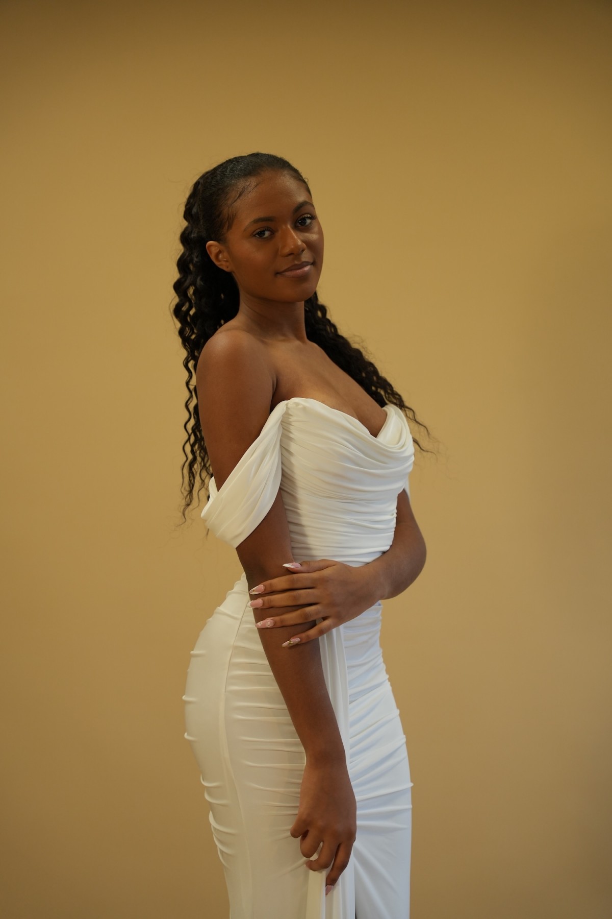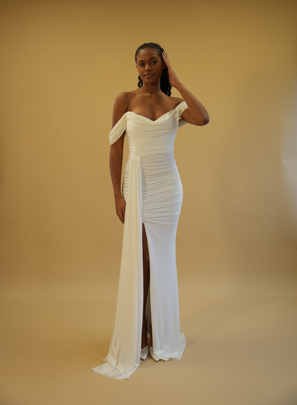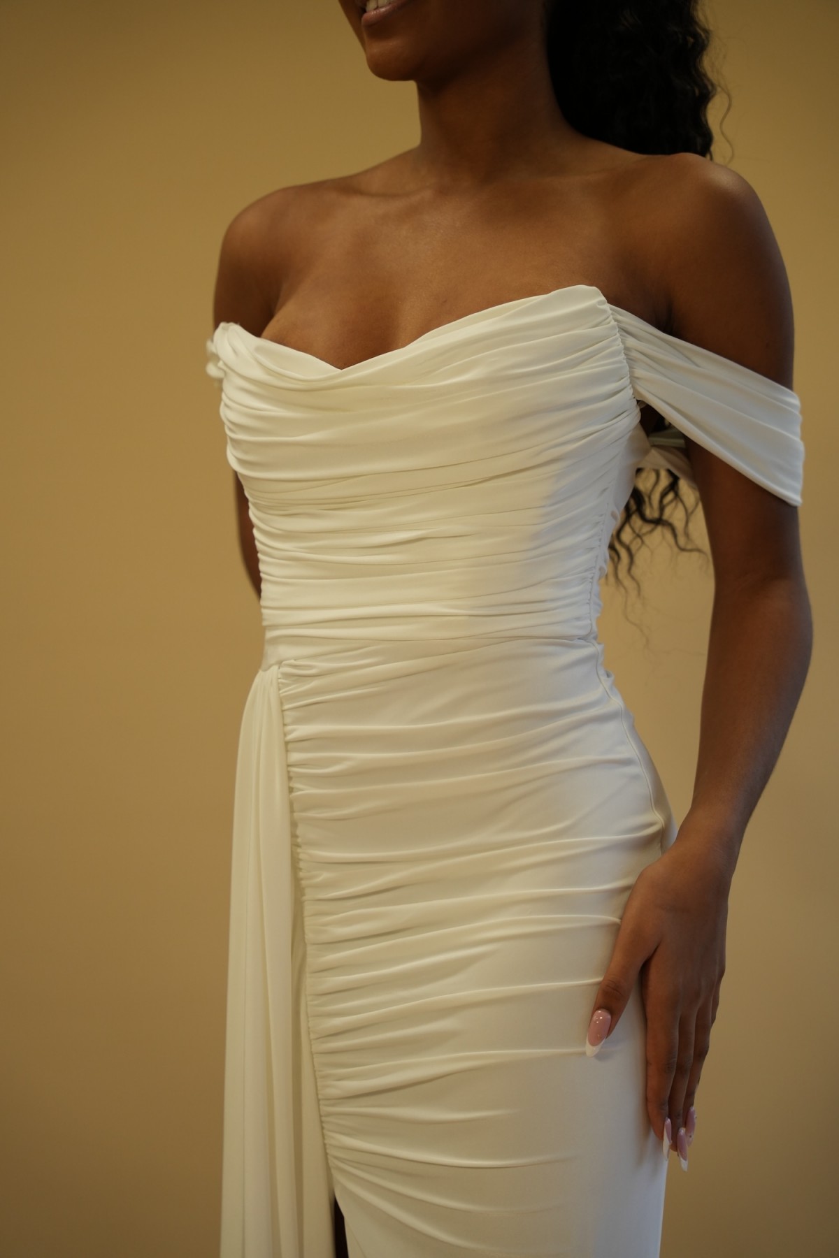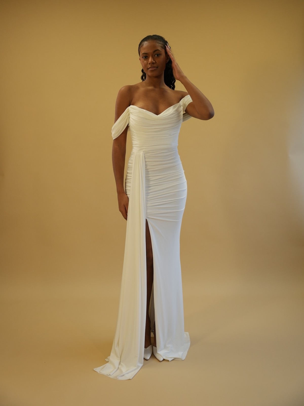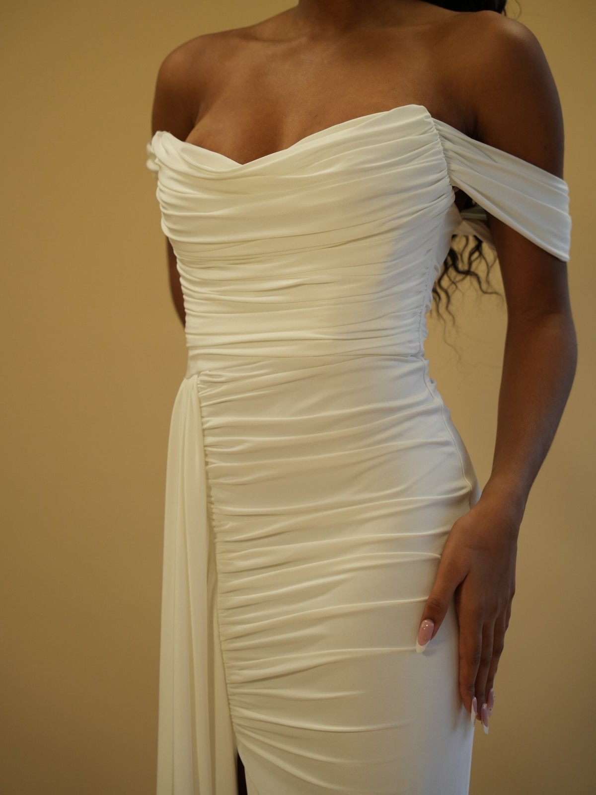 Robe longue drapée épaules dégagées - blanc