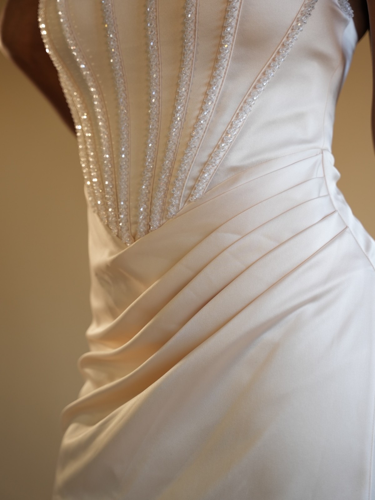Robe longue satinée beige clair, coupe sirène, bustier structuré effet corset avec détails verticaux délicatement soulignés. Drapé élégant à la taille et fente asymétrique pour une allure féminine et sophistiquée.