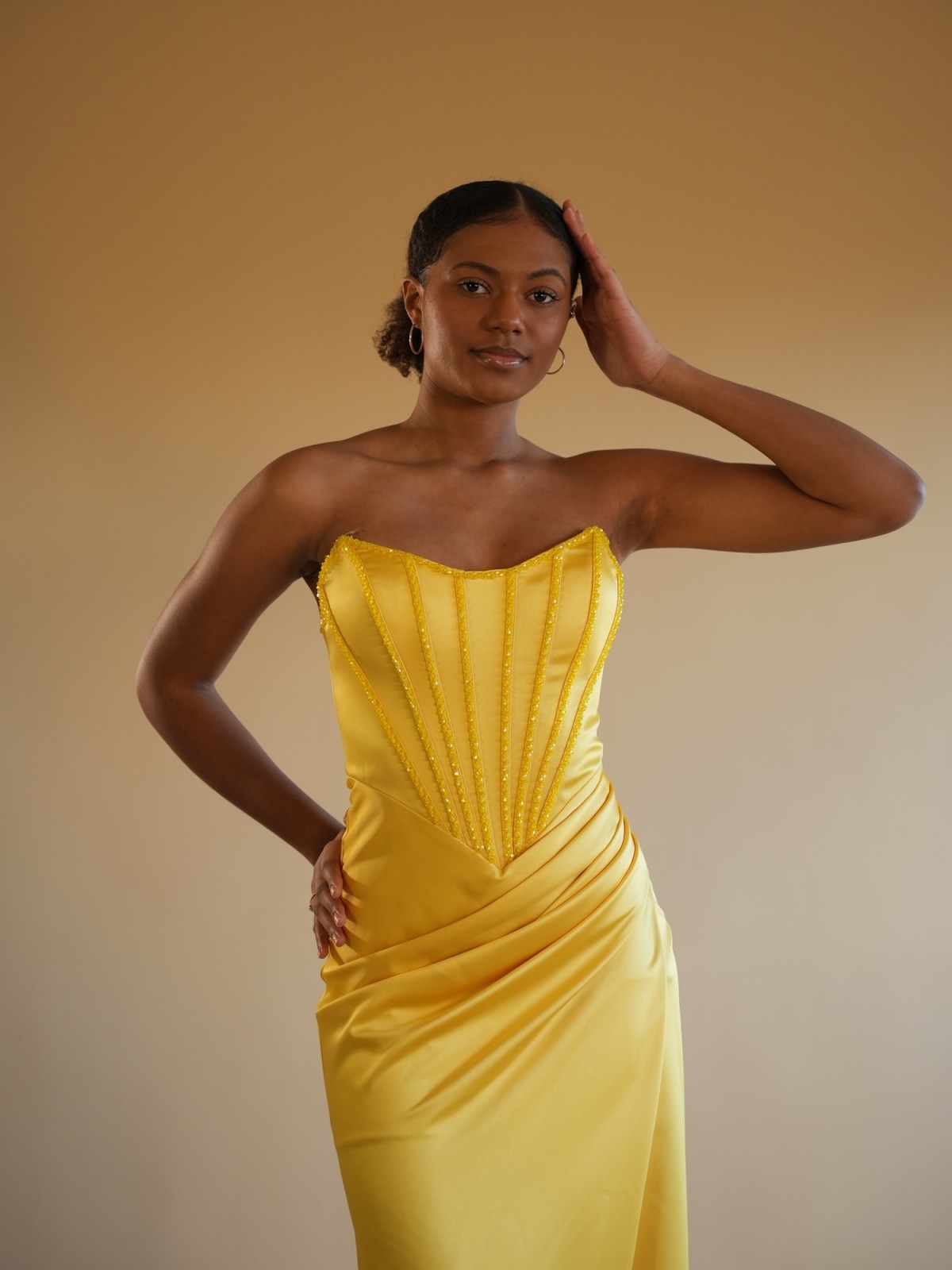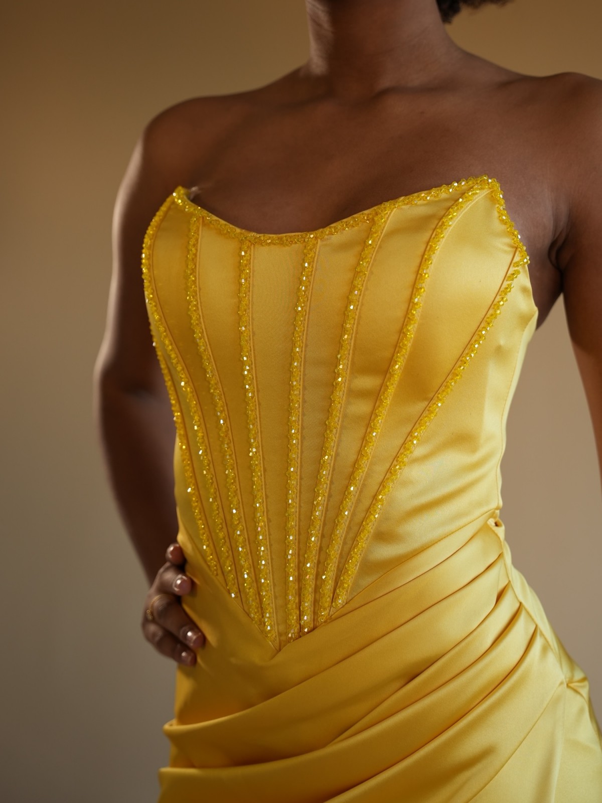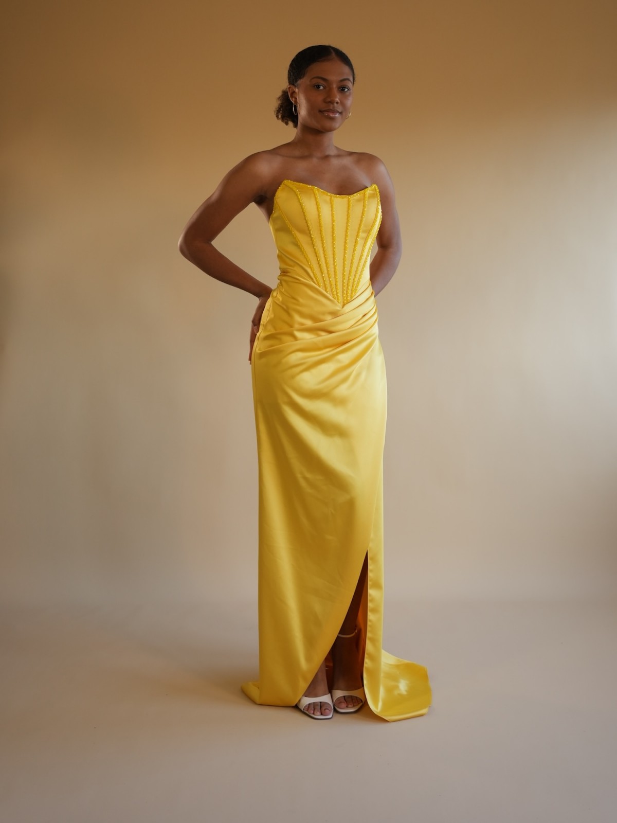 Robe longue satinée jaune soleil, coupe sirène, bustier structuré effet corset avec détails verticaux délicatement soulignés. Drapé élégant à la taille et fente asymétrique pour une allure féminine et sophistiquée.