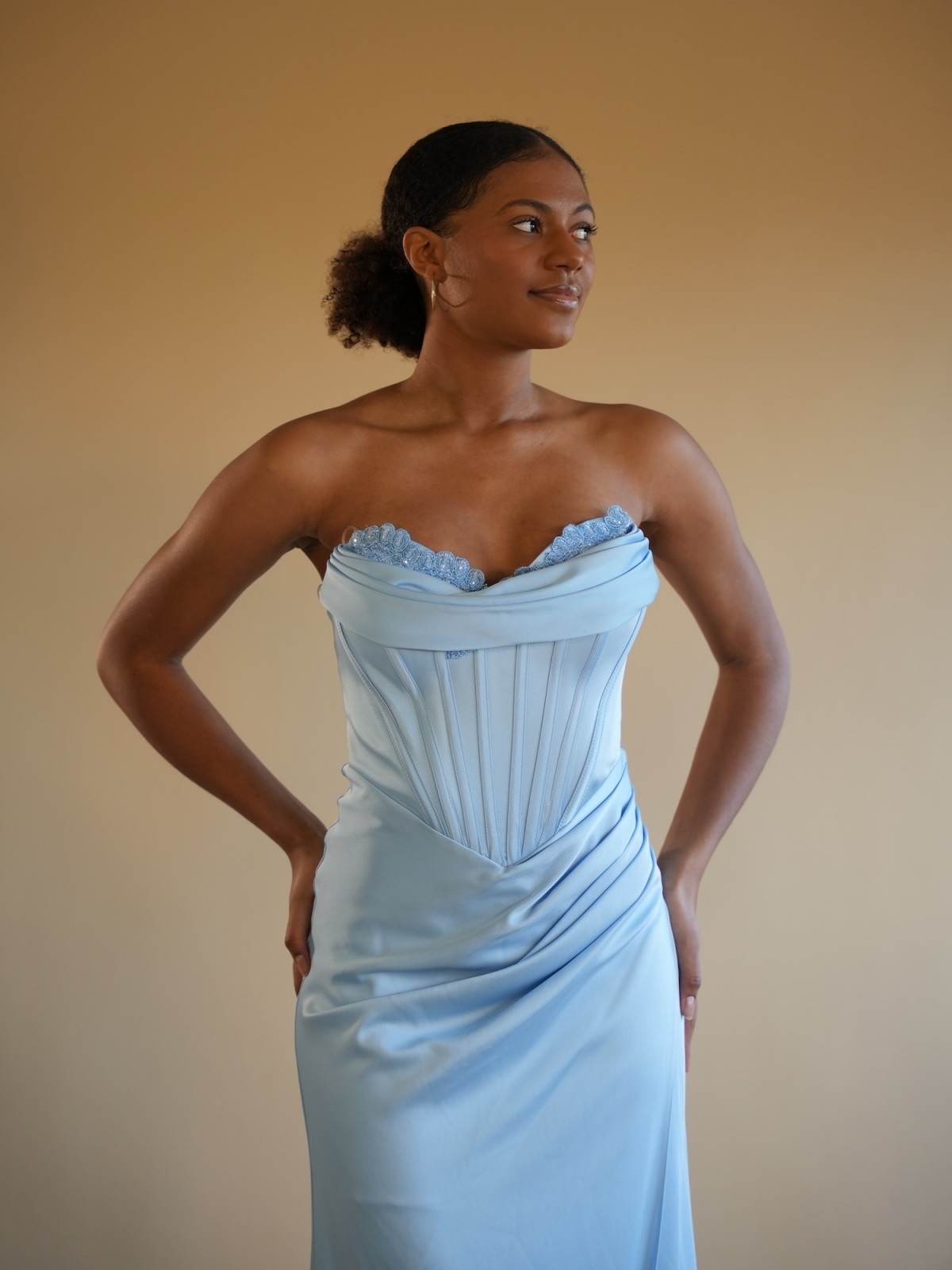 Robe longue satinée bleu ciel, coupe sirène, bustier structuré effet corset avec détails verticaux délicatement soulignés. Drapé élégant à la taille et fente asymétrique.