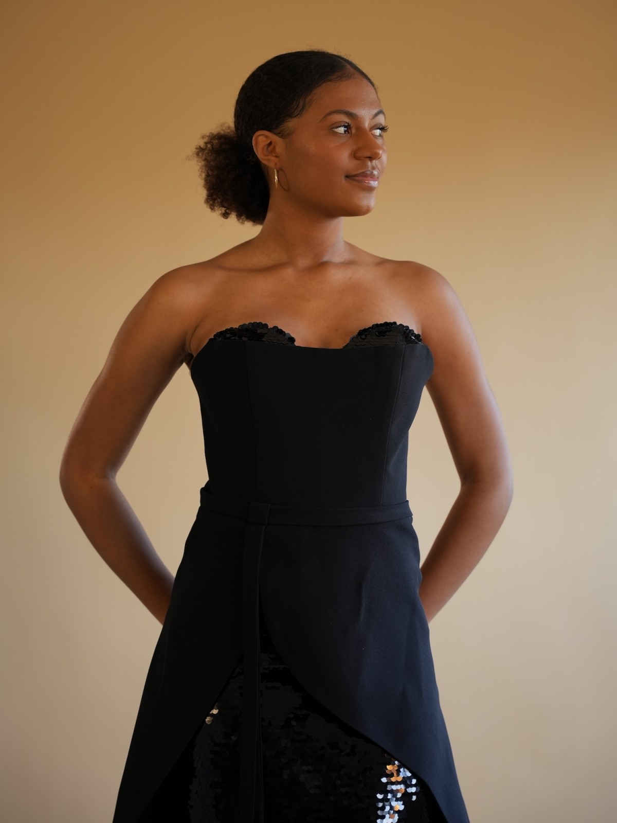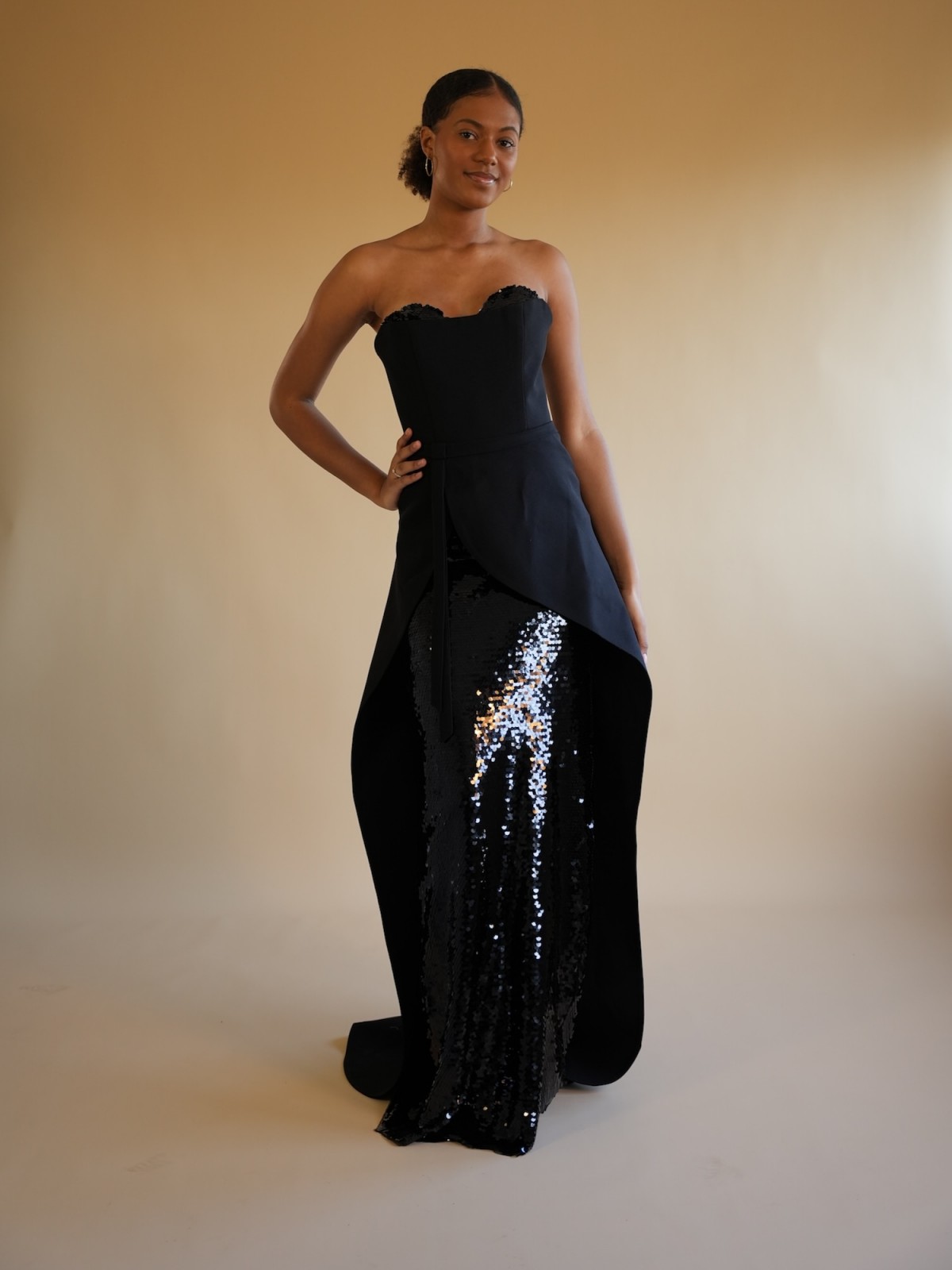 Robe longue bustier noire avec drapé asymétrique à la taille et jupe en sequins scintillants.