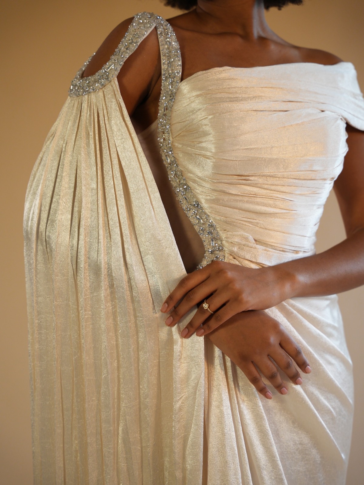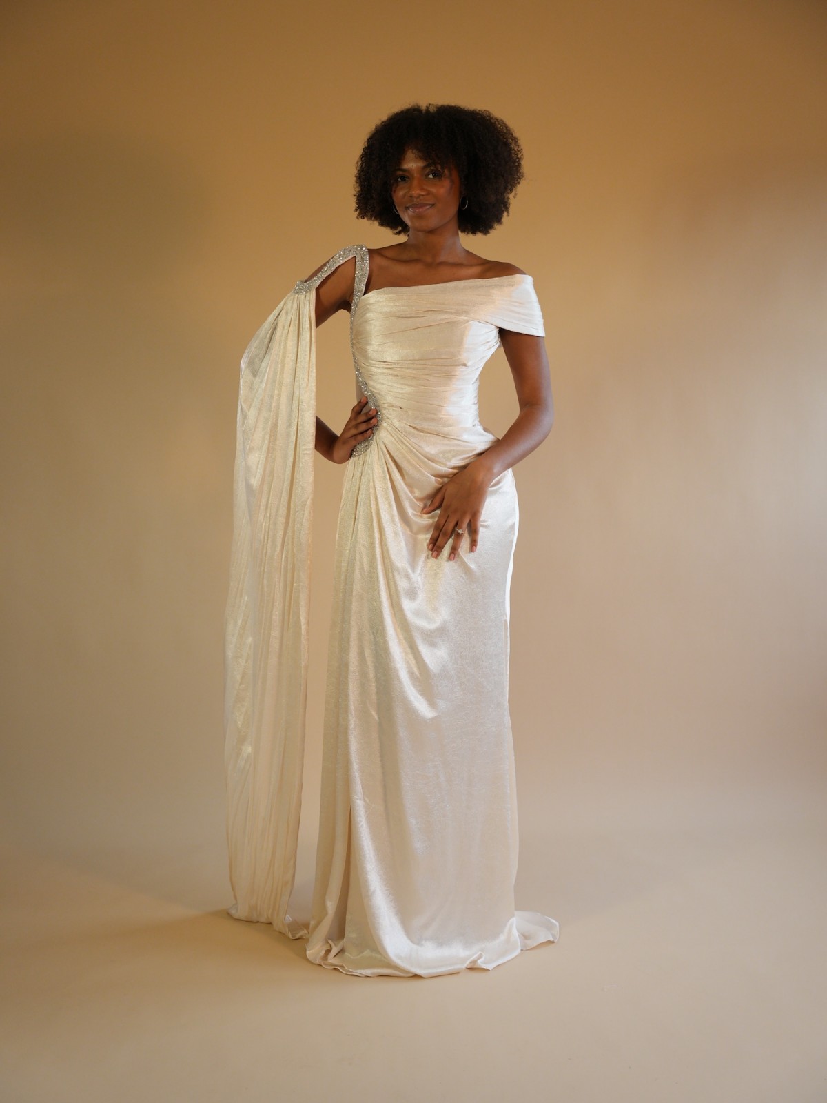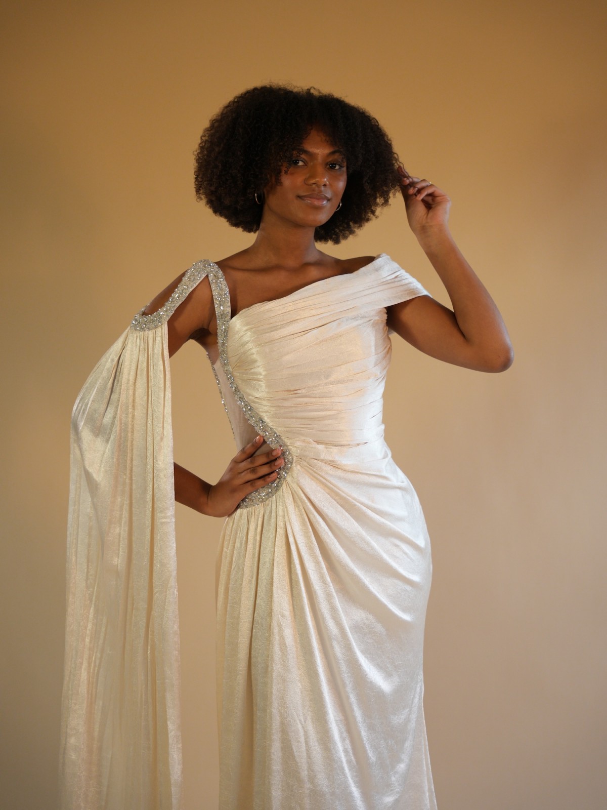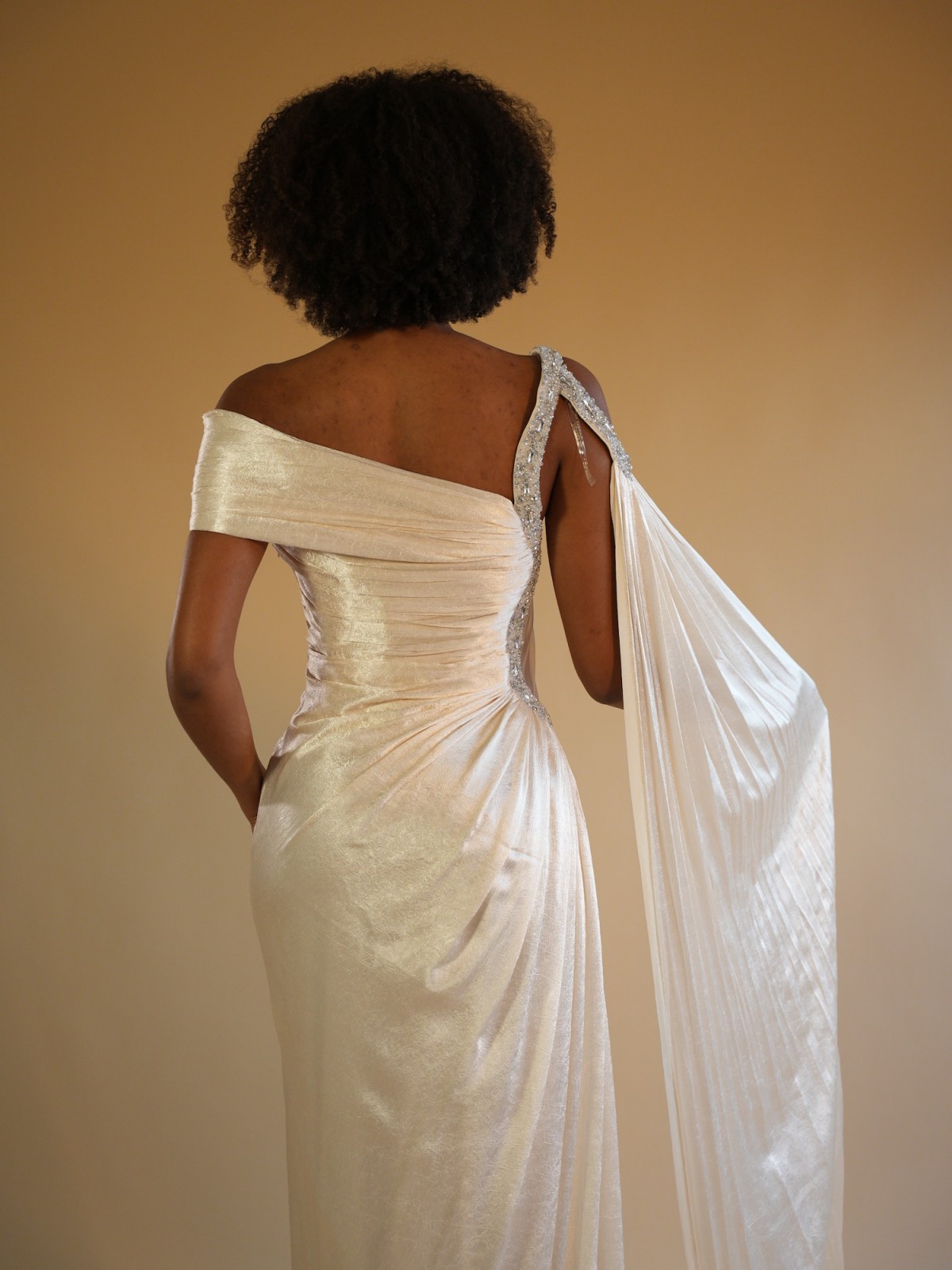 Robe longue blanc écru avec drapé asymétrique à la taille, épaule ornée de détails scintillants.