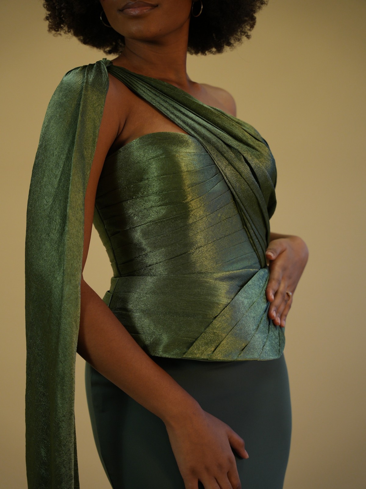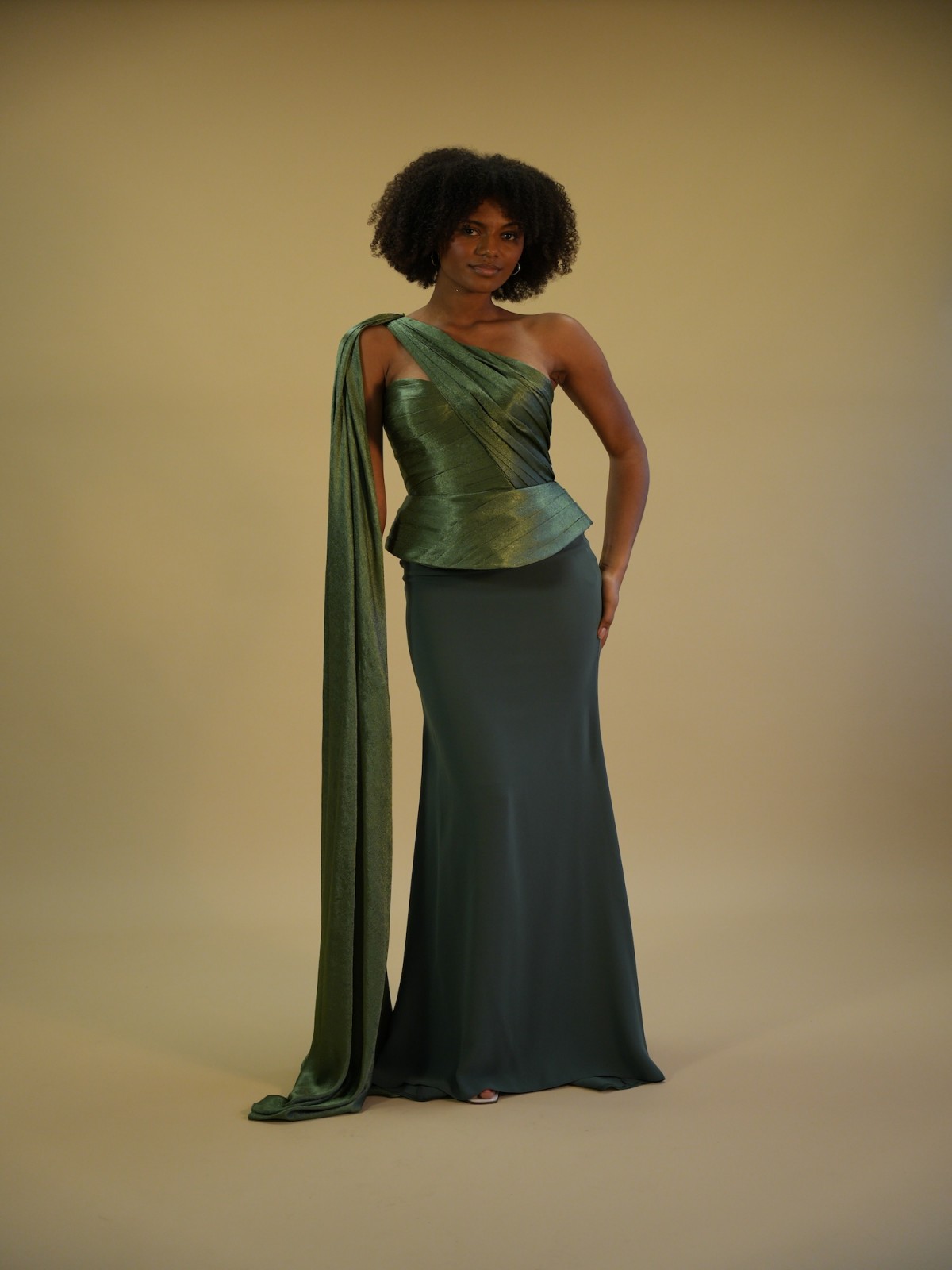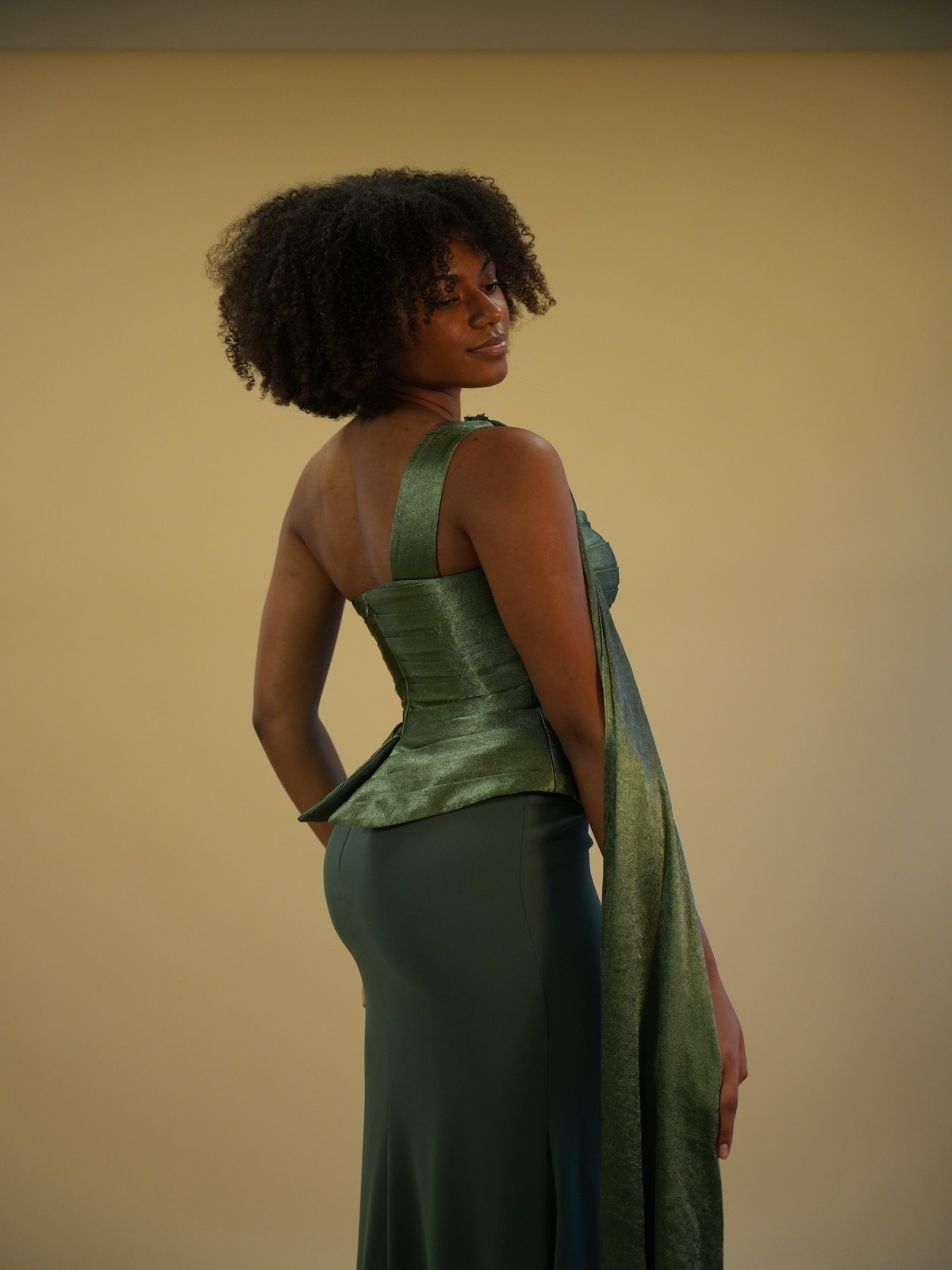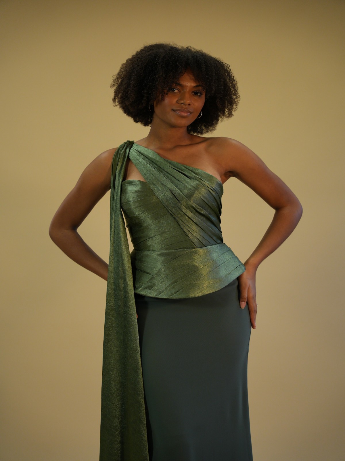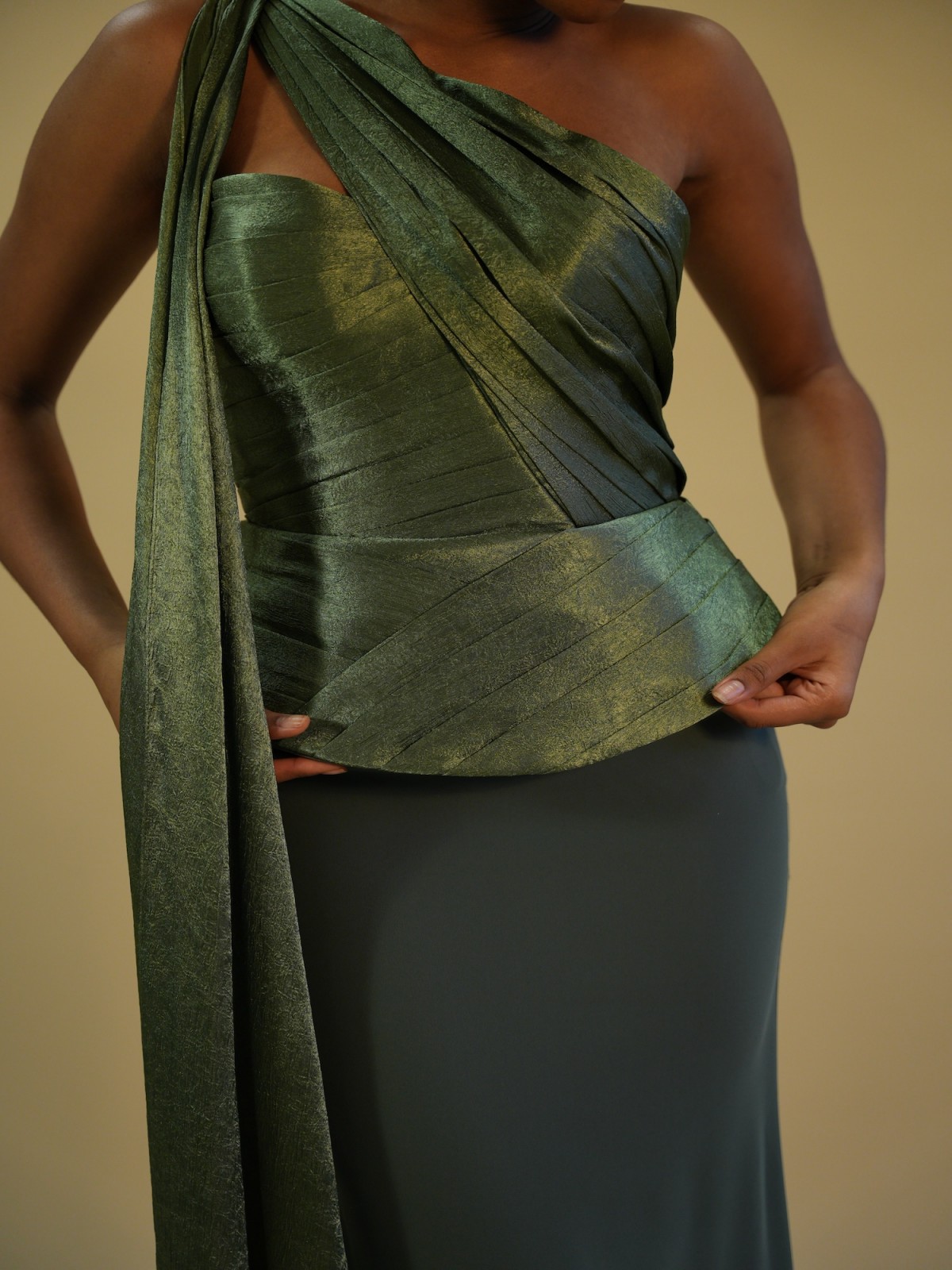 Robe longue vert kaki, avec bustier structuré et drapé, avec une cape.