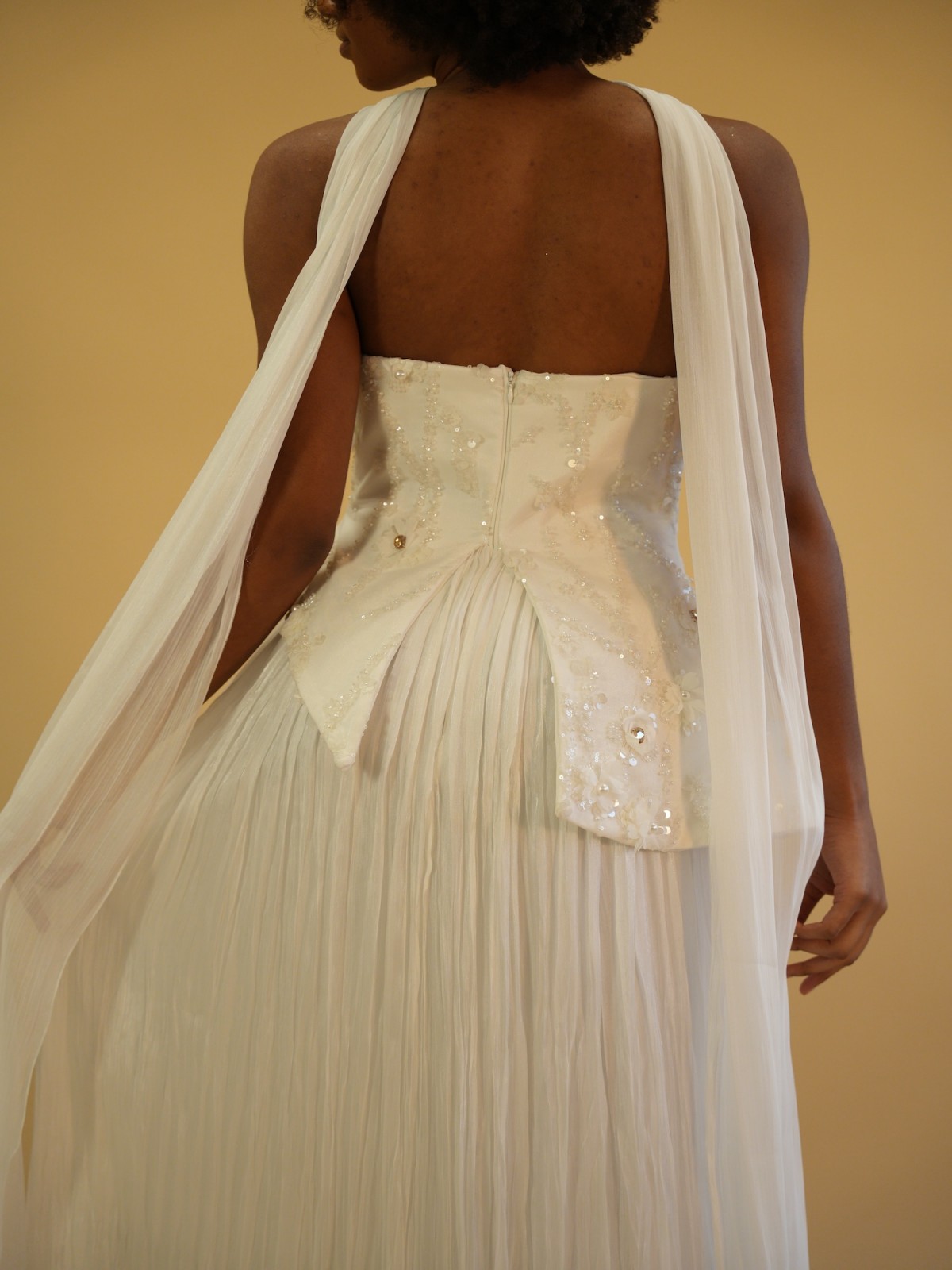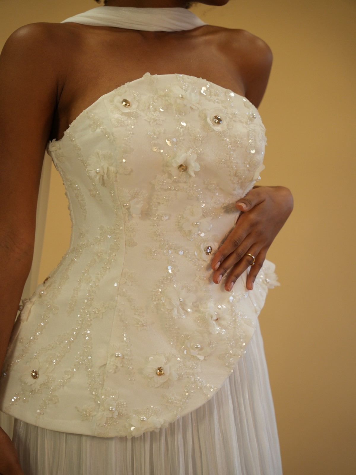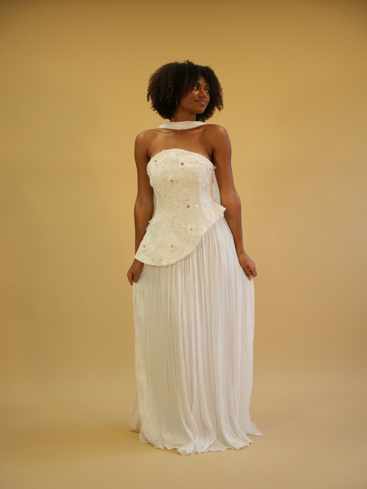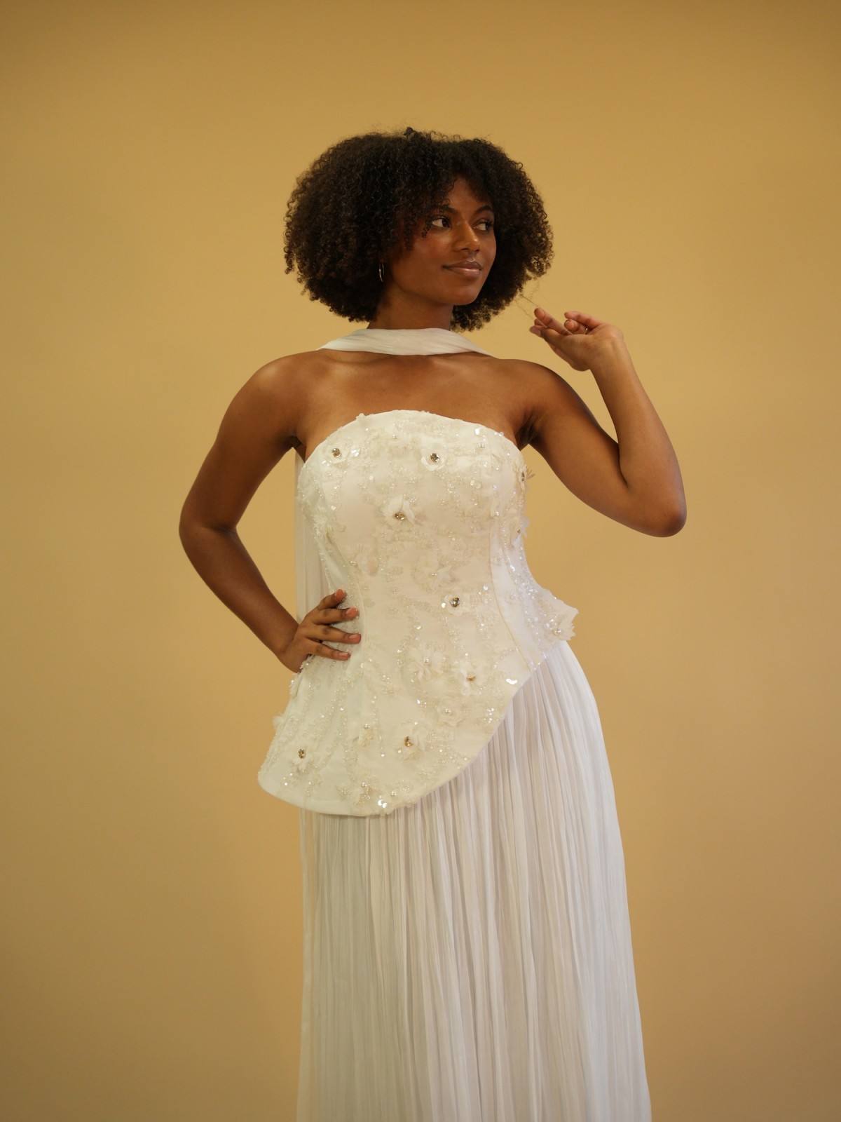 Robe longue blanche avec bustier structuré orné de détails floraux et sequins délicats, accompagnée d’une jupe plissée fluide.