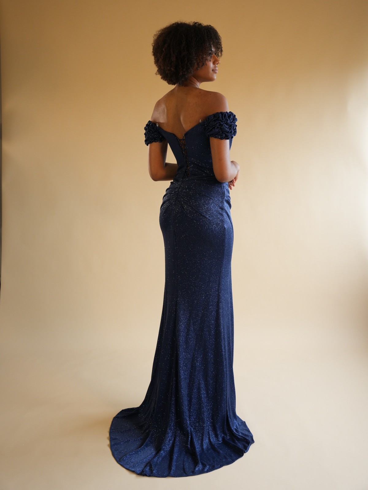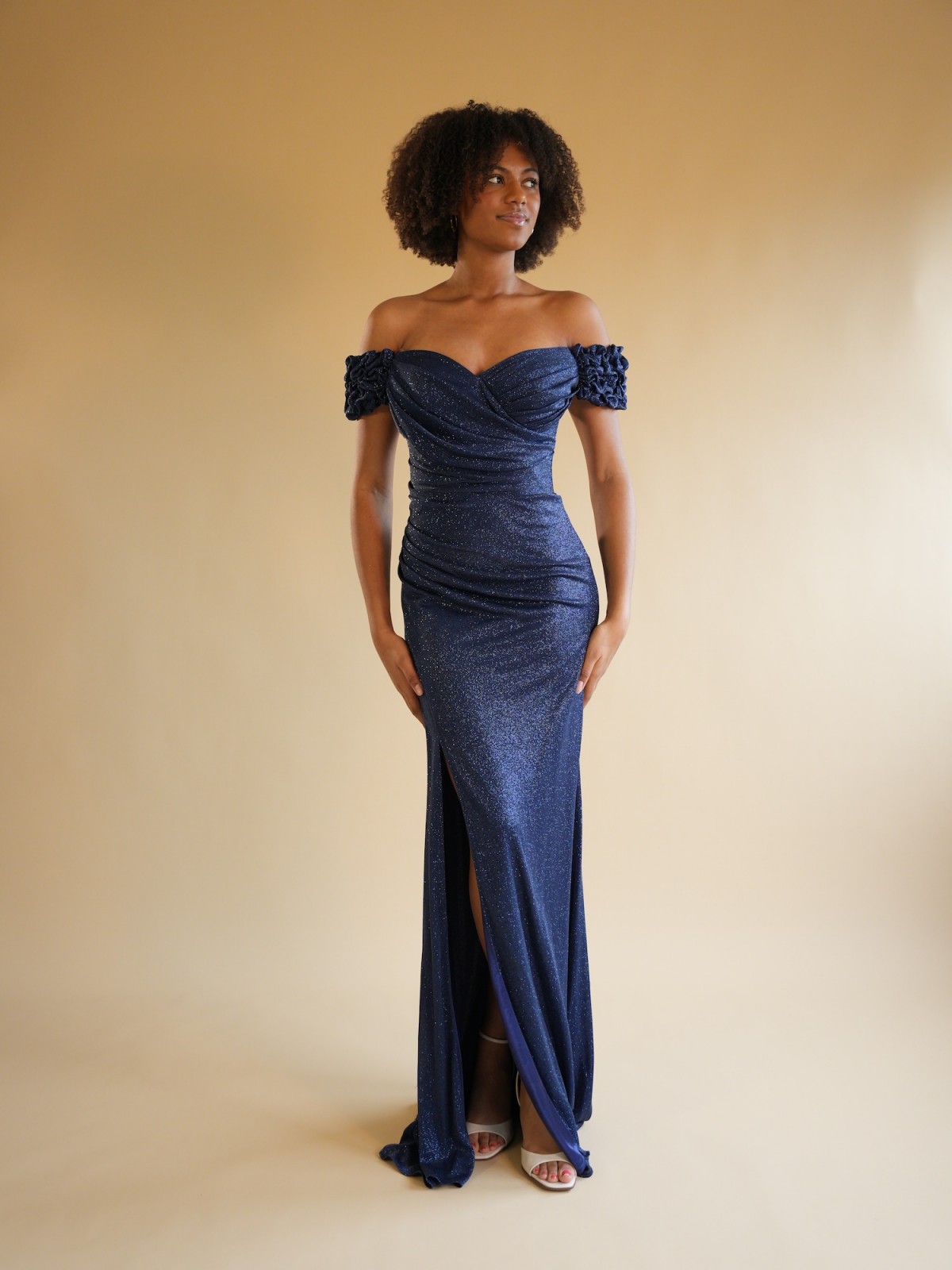 Robe longue bleu nuit avec épaules dénudées et bustier drapé, tissu scintillant avec fente élégante.