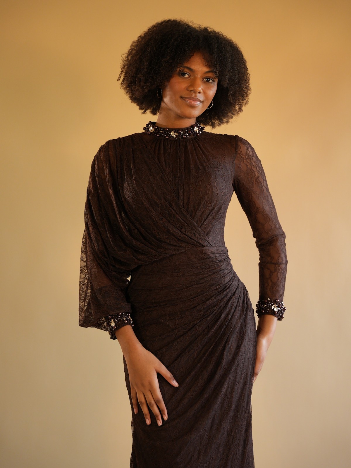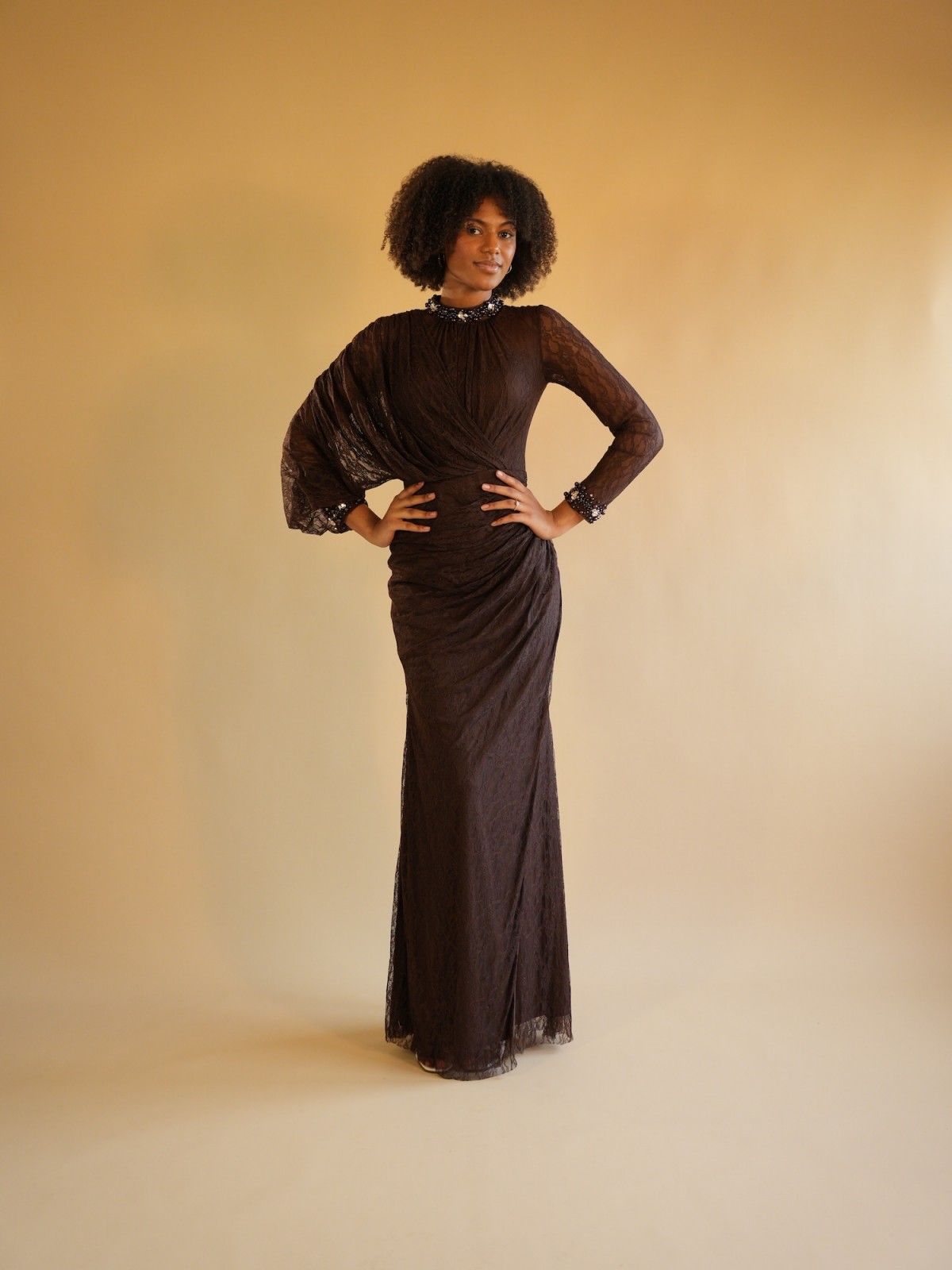 Robe longue marron en dentelle près du corps, avec ornements au niveau des manches et du col, manche papillon.