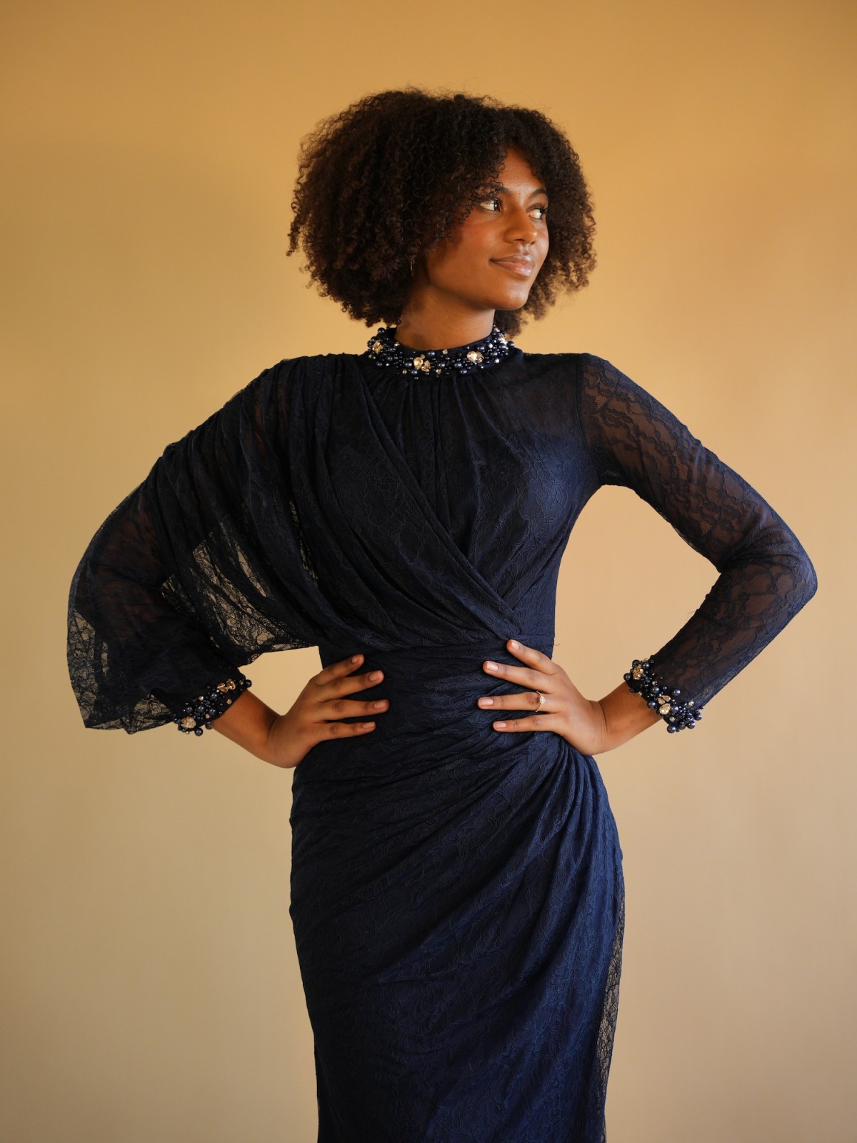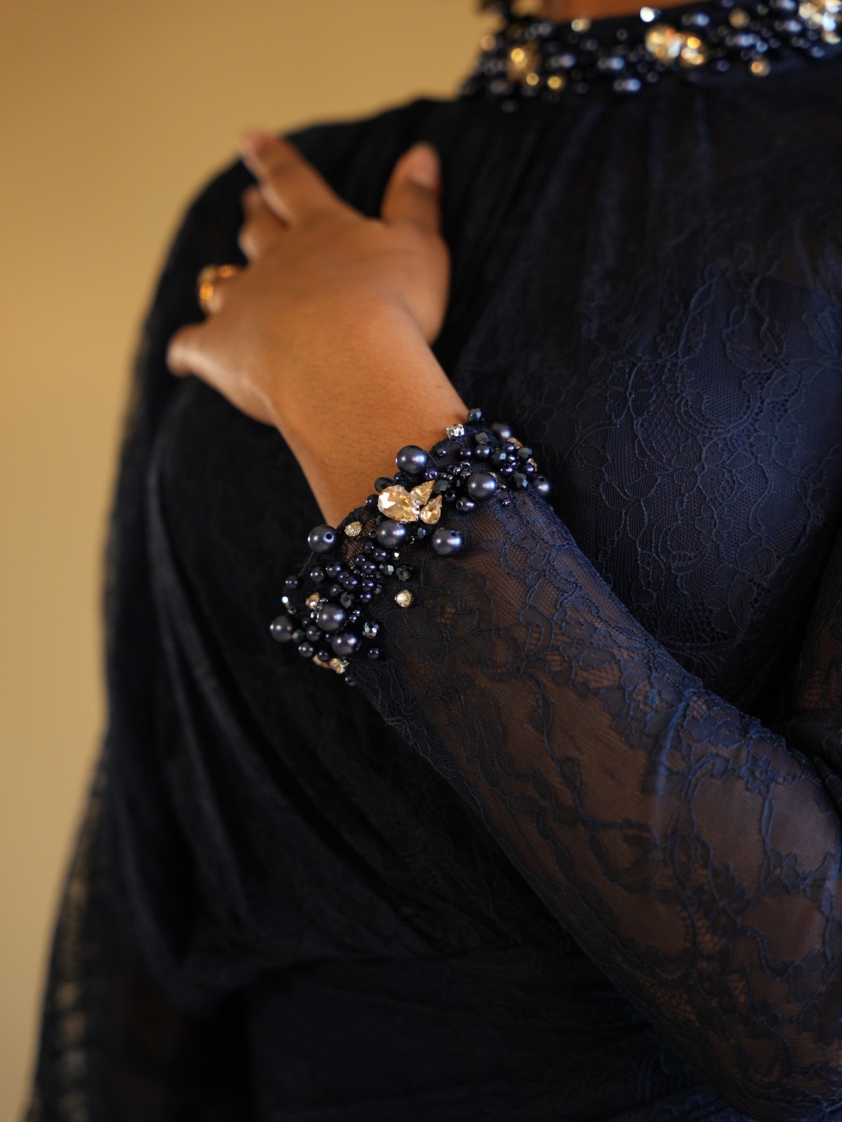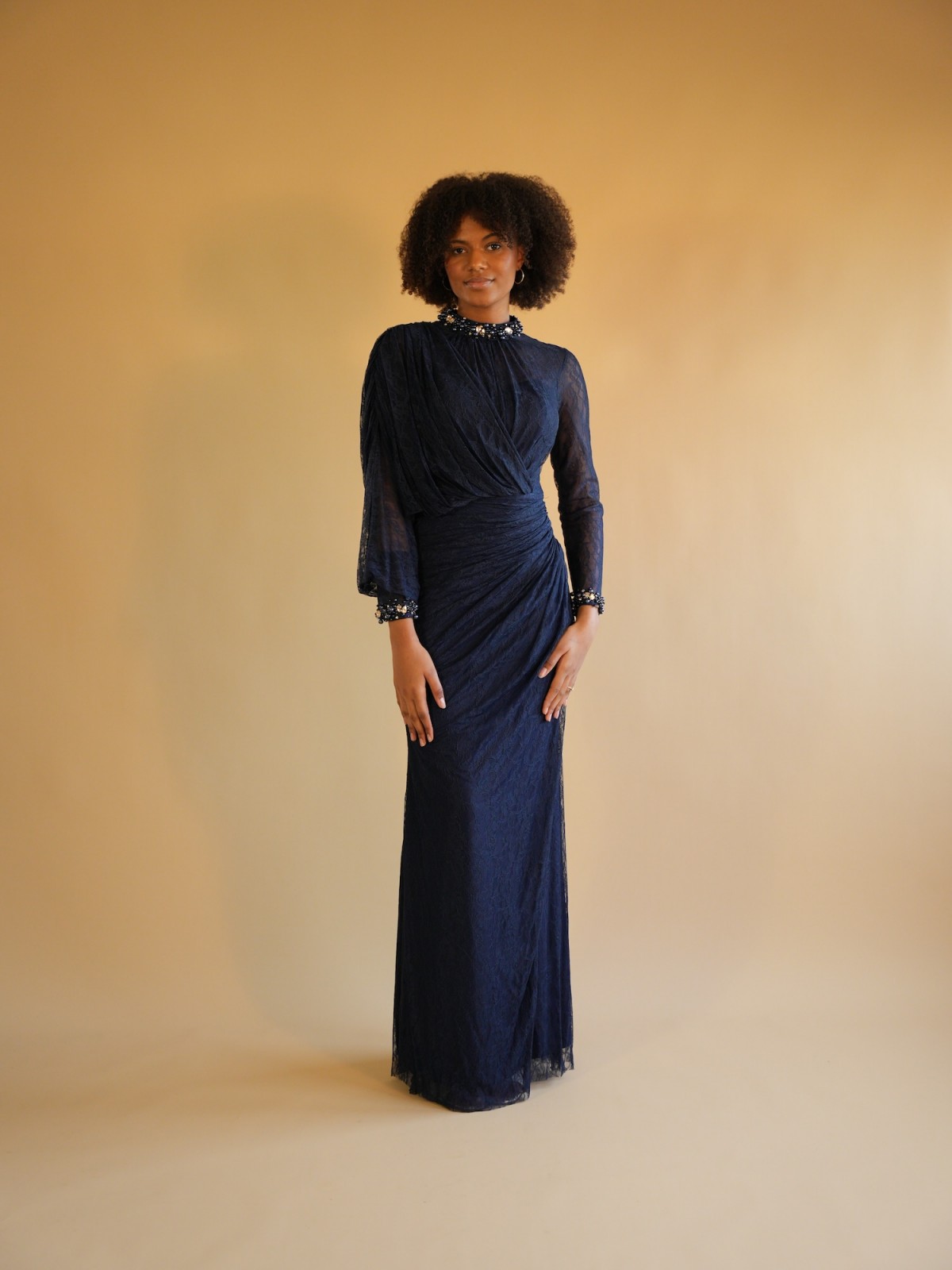 Robe longue bleu nuit en dentelle près du corps, avec ornements au niveau des manches et du col, manche papillon.