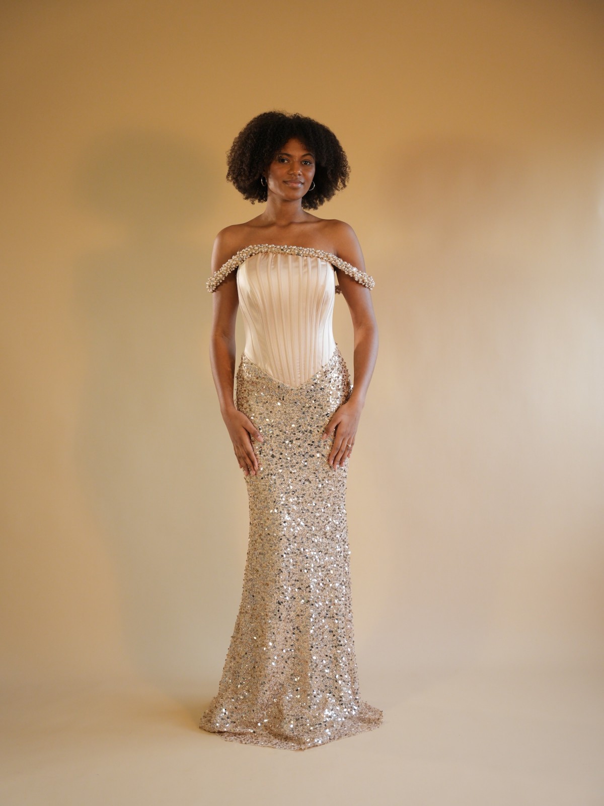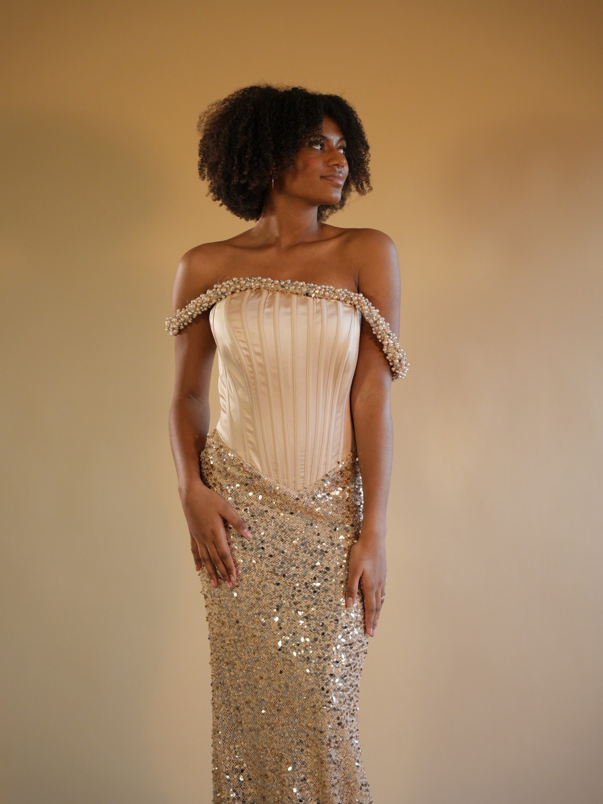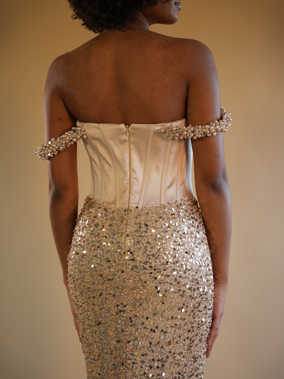 Robe longue beige avec épaules dénudées et bustier structuré, tissu scintillant avec fente élégante.