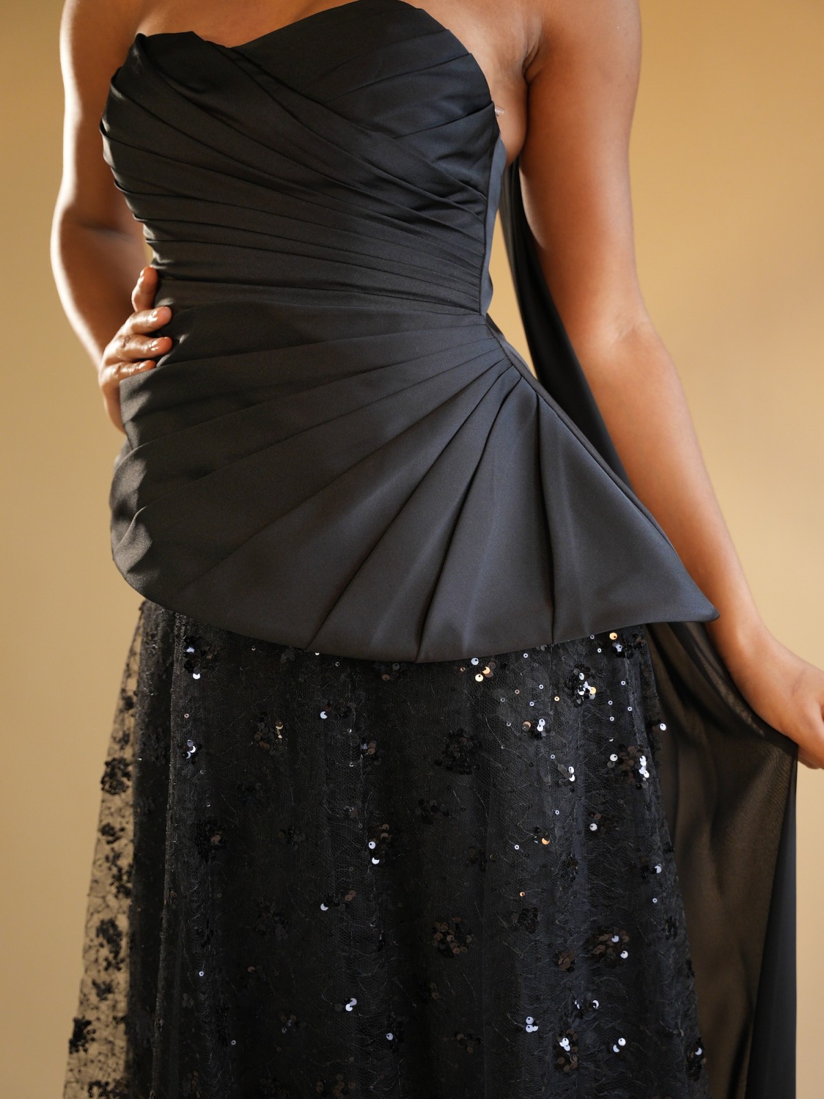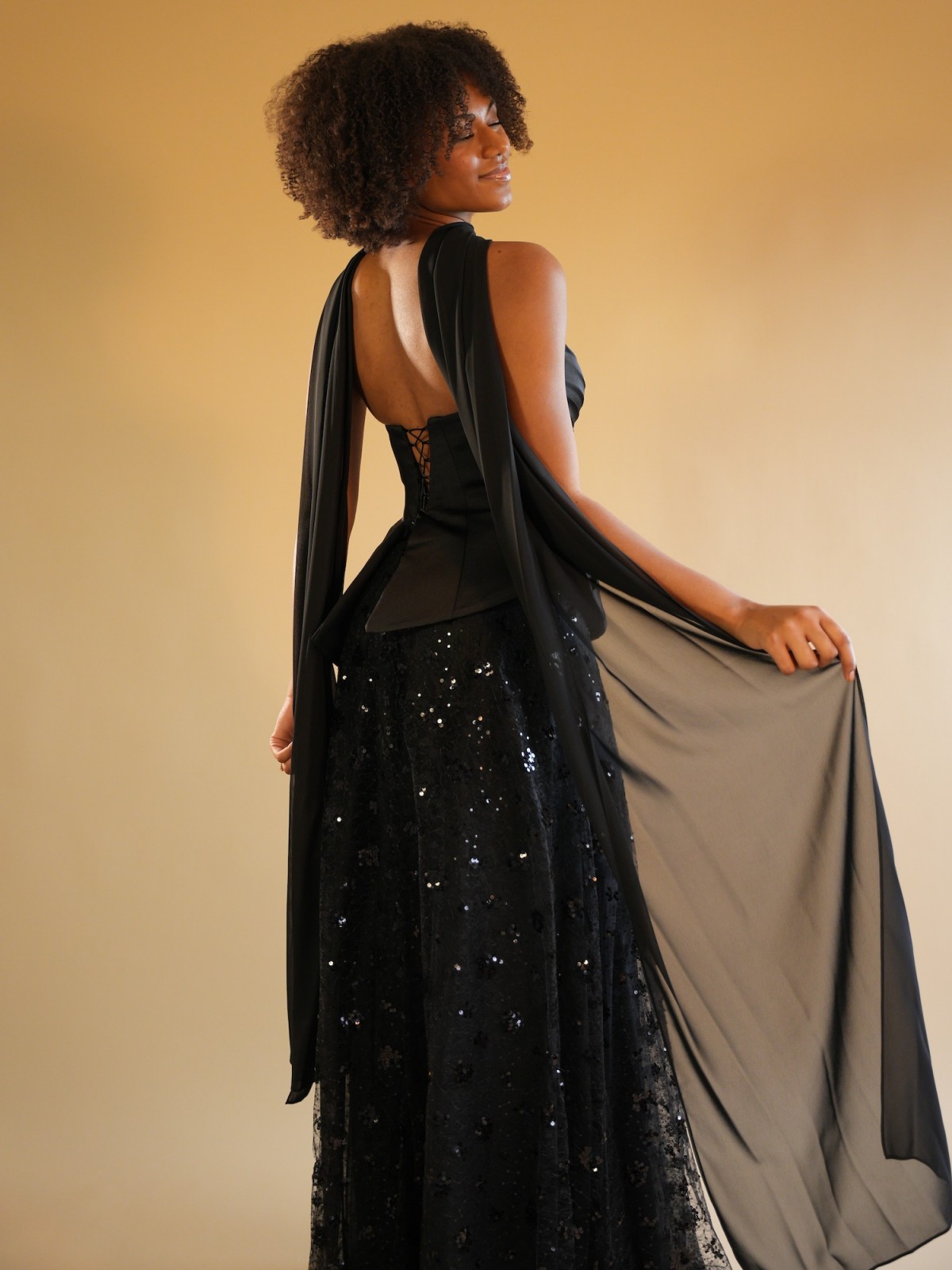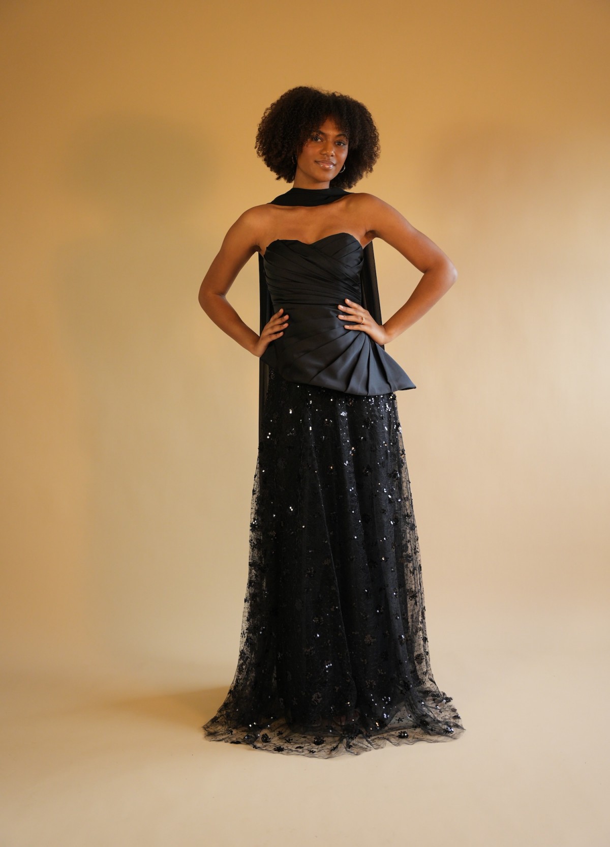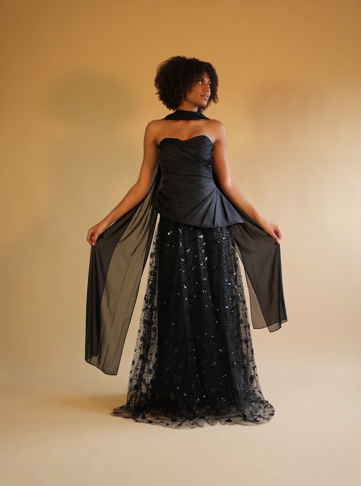 Robe longue noir avec un bustier structuré satiné, jupe recouverte de détails à paillette, écharpe noir